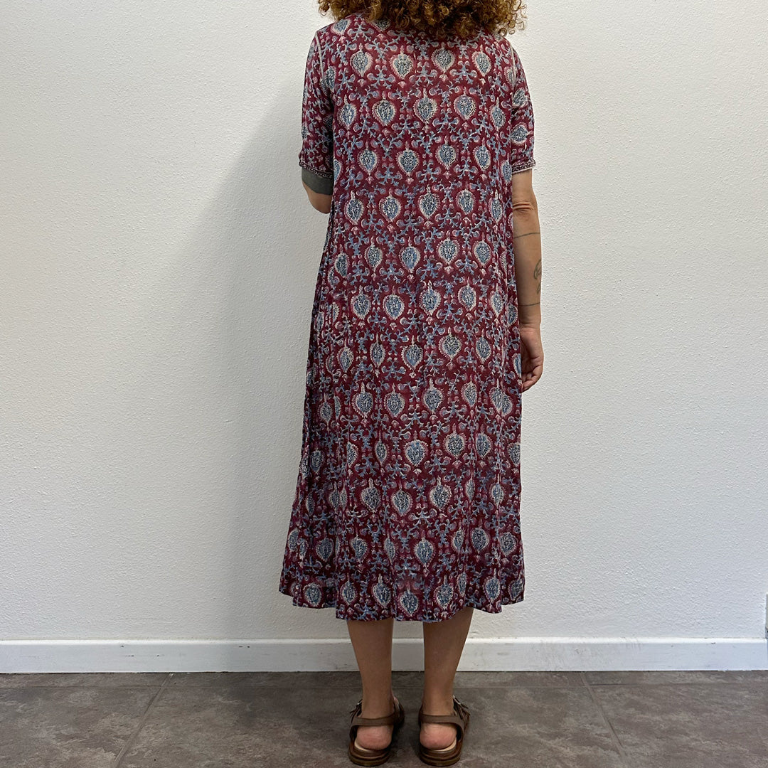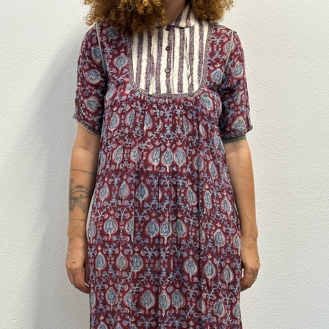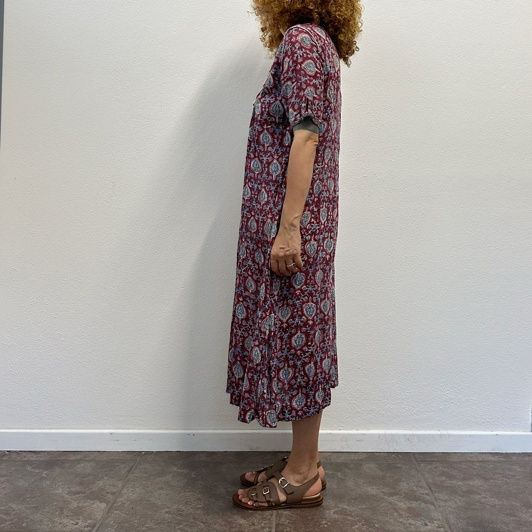 Affascinante abito indiano fine anni ’70, realizzato in mussola di cotone leggera e traspirante, con stampa nei toni del rosso, noir, carta da zucchero e bianco. Linea fluida, manica corta e silhouette morbida. Un capo autentico, ricco di storia e perfetto per l’estate.
