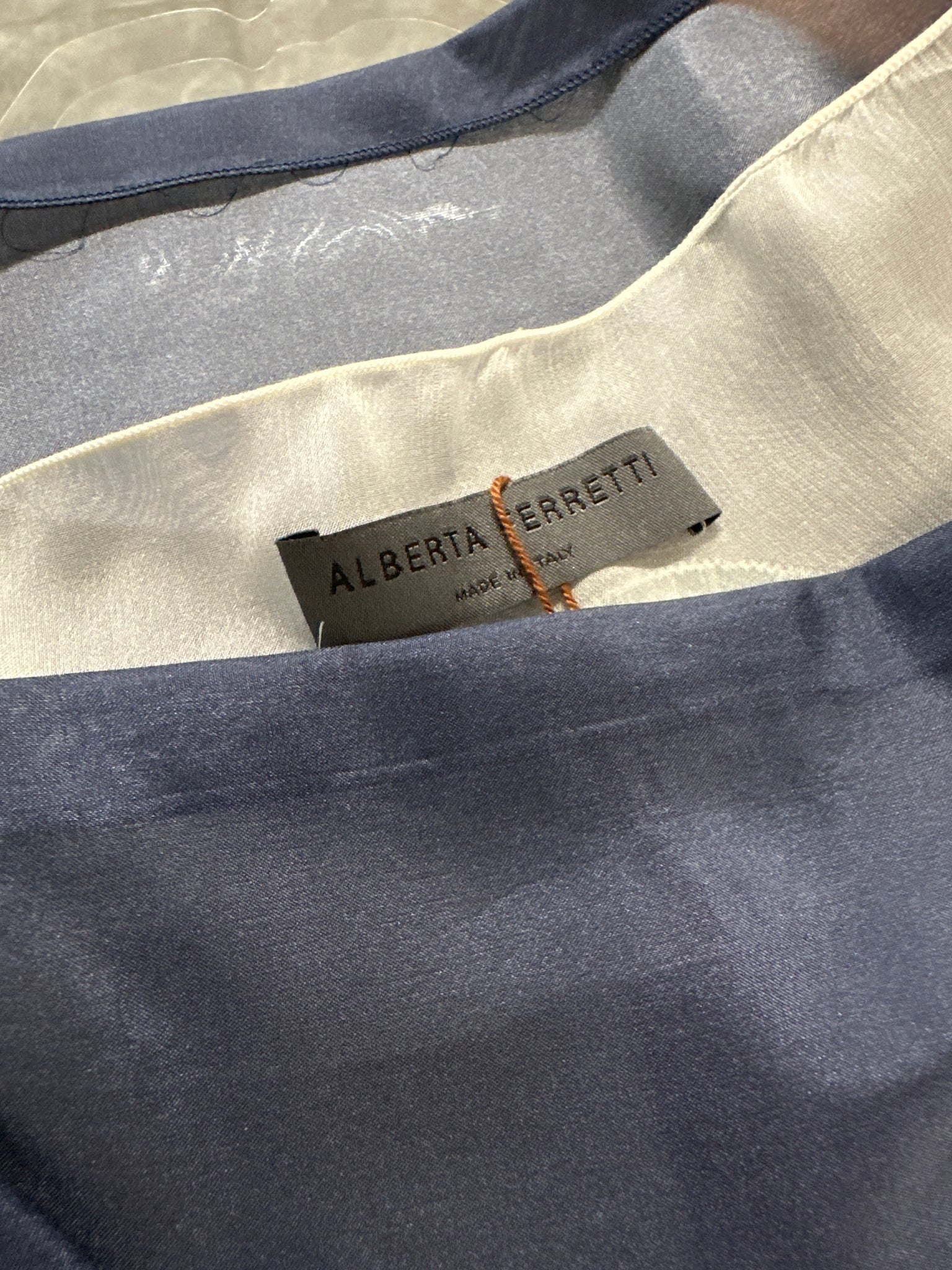 Alberta Ferretti è una delle stiliste italiane più apprezzate a livello internazionale per la sua estetica romantica, leggera e femminile. I suoi abiti, spesso realizzati in seta e chiffon, sono celebri per il movimento fluido, i dettagli couture e il gusto etereo. Questo pezzo, proveniente dagli anni ’90, rappresenta in pieno la raffinatezza della maison.