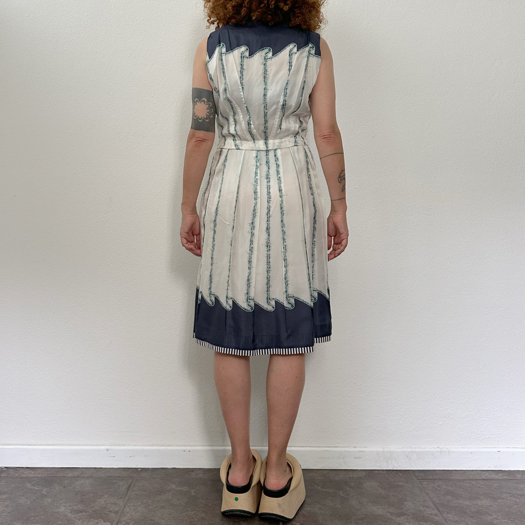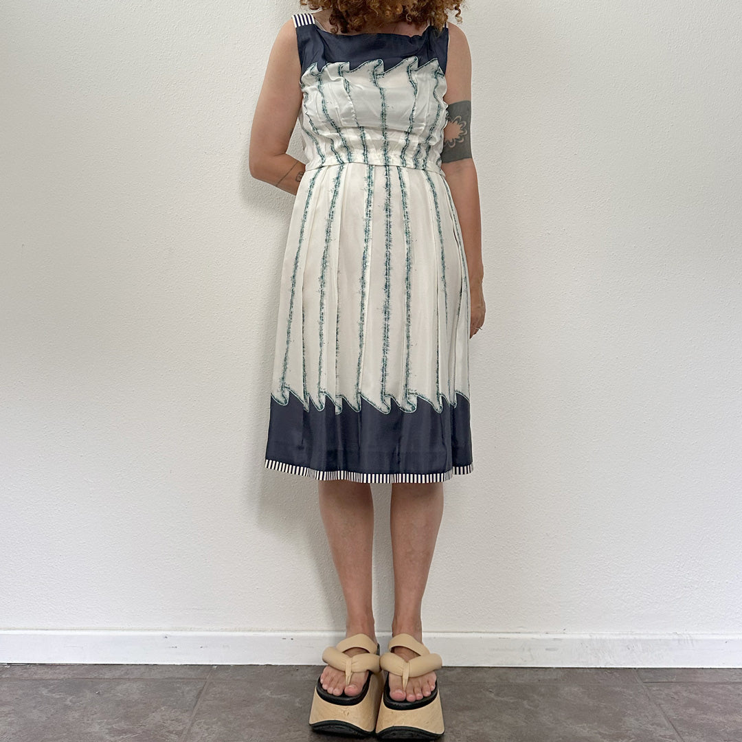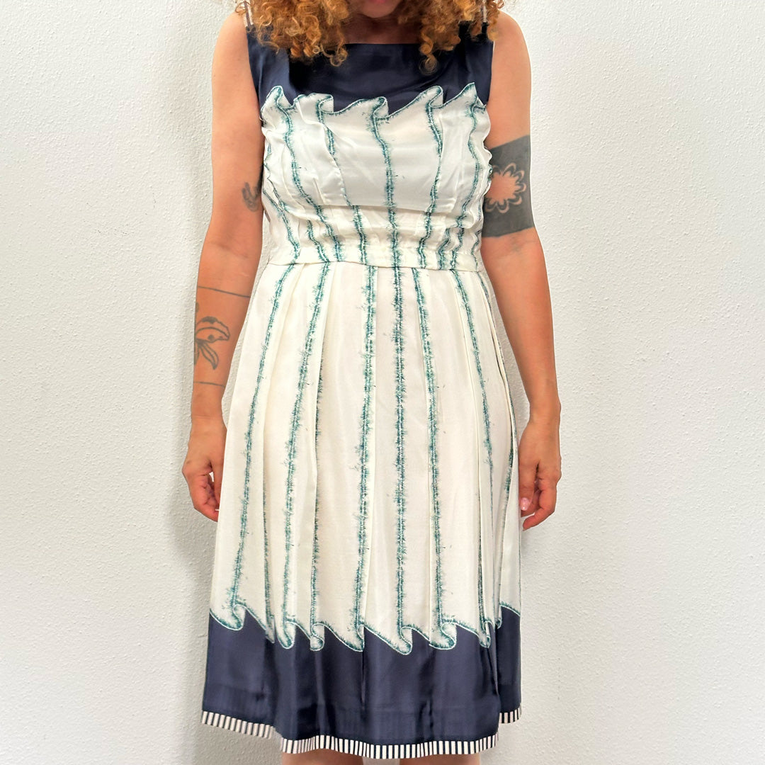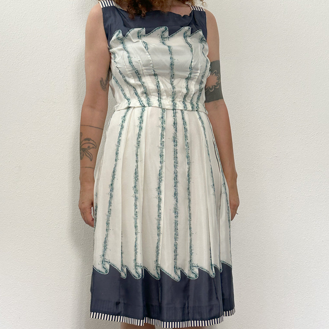 Un capolavoro di eleganza e illusione ottica: abito Alberta Ferretti fine anni ’90, in 100% pura seta, con un eccezionale gioco di pieghe e stampe effetto trompe-l’œil. I colori — bianco, blu e petrolio — si fondono in un pattern sofisticato, dal carattere artistico e senza tempo.