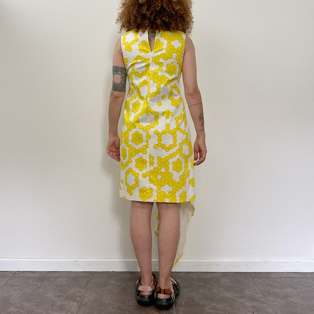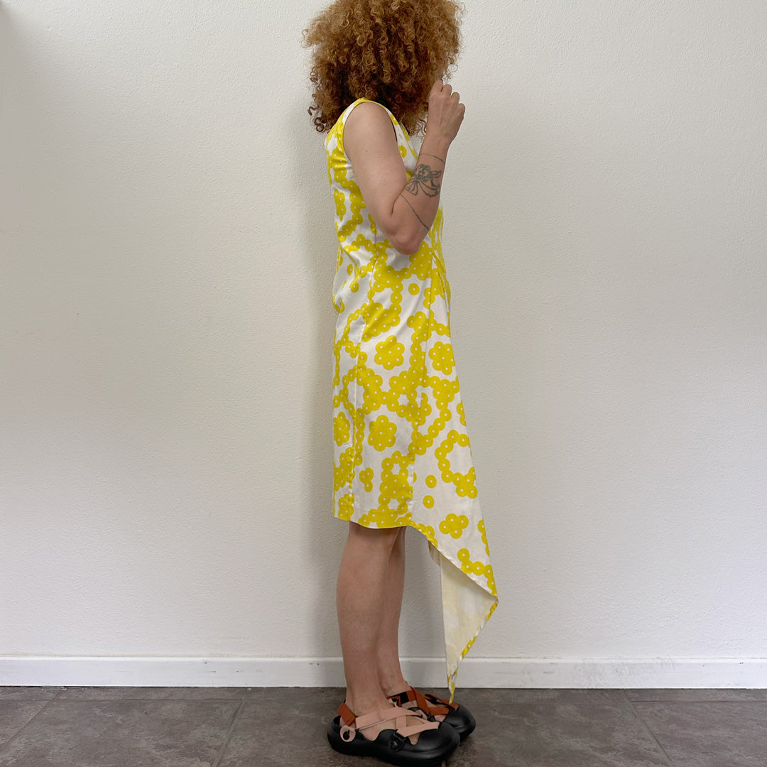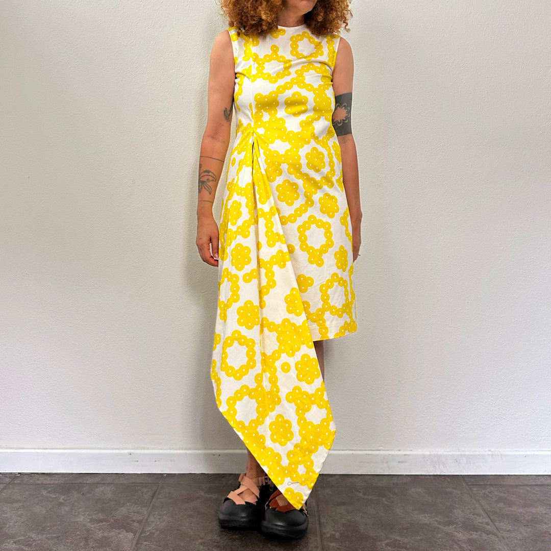 Realizzato in un tessuto simile al cotone con una leggera elasticità, è di colore bianco con una stampa floreale stilizzata gialla, essenziale e grafica. La linea asimmetrica e il taglio studiato donano movimento e struttura al capo, rendendolo perfetto per chi ama i design audaci ma sofisticati.