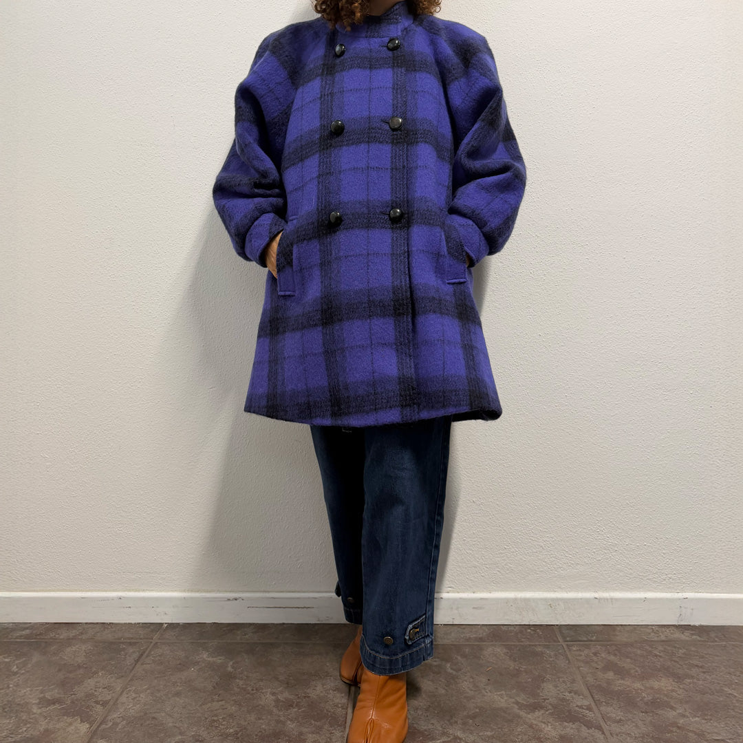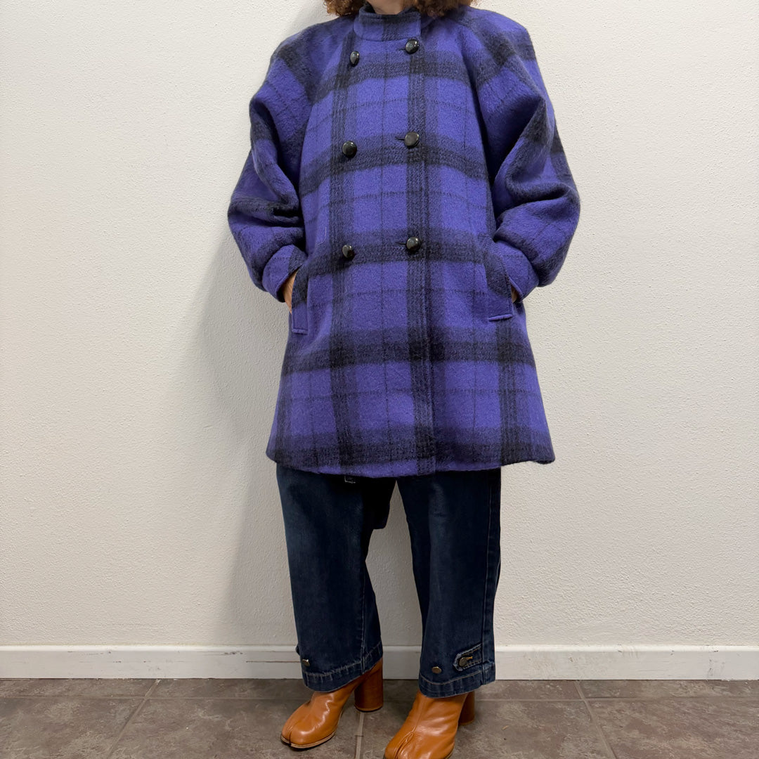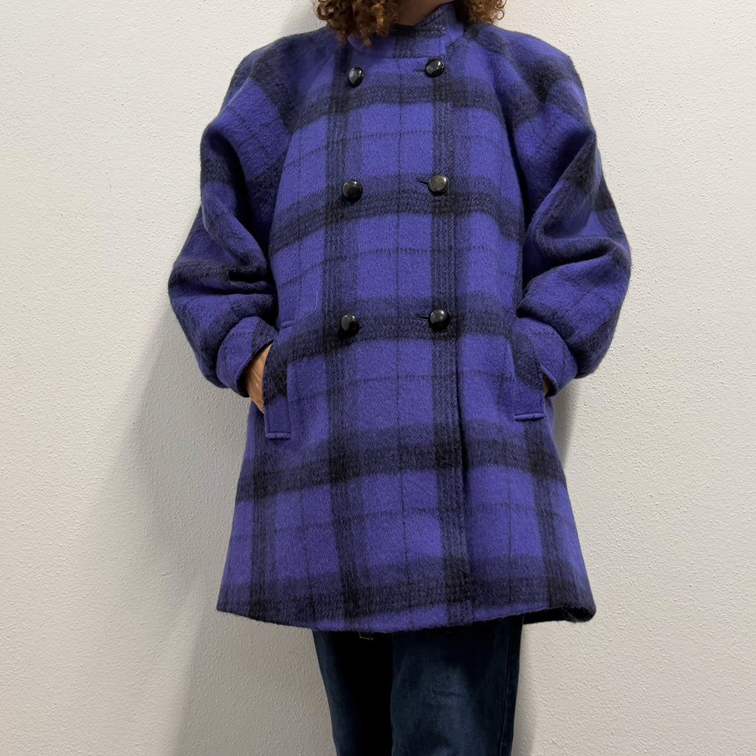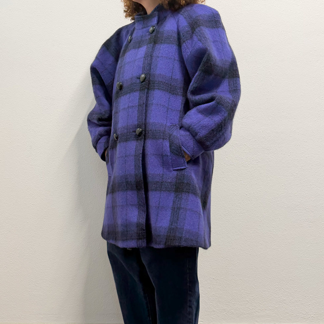 Cappotto sartoriale dallo stile unico, caratterizzato da un vivace pattern check viola. Il tessuto, che al tatto risulta decisamente lana, offre una sensazione calda e avvolgente, perfetta per la stagione fredda.