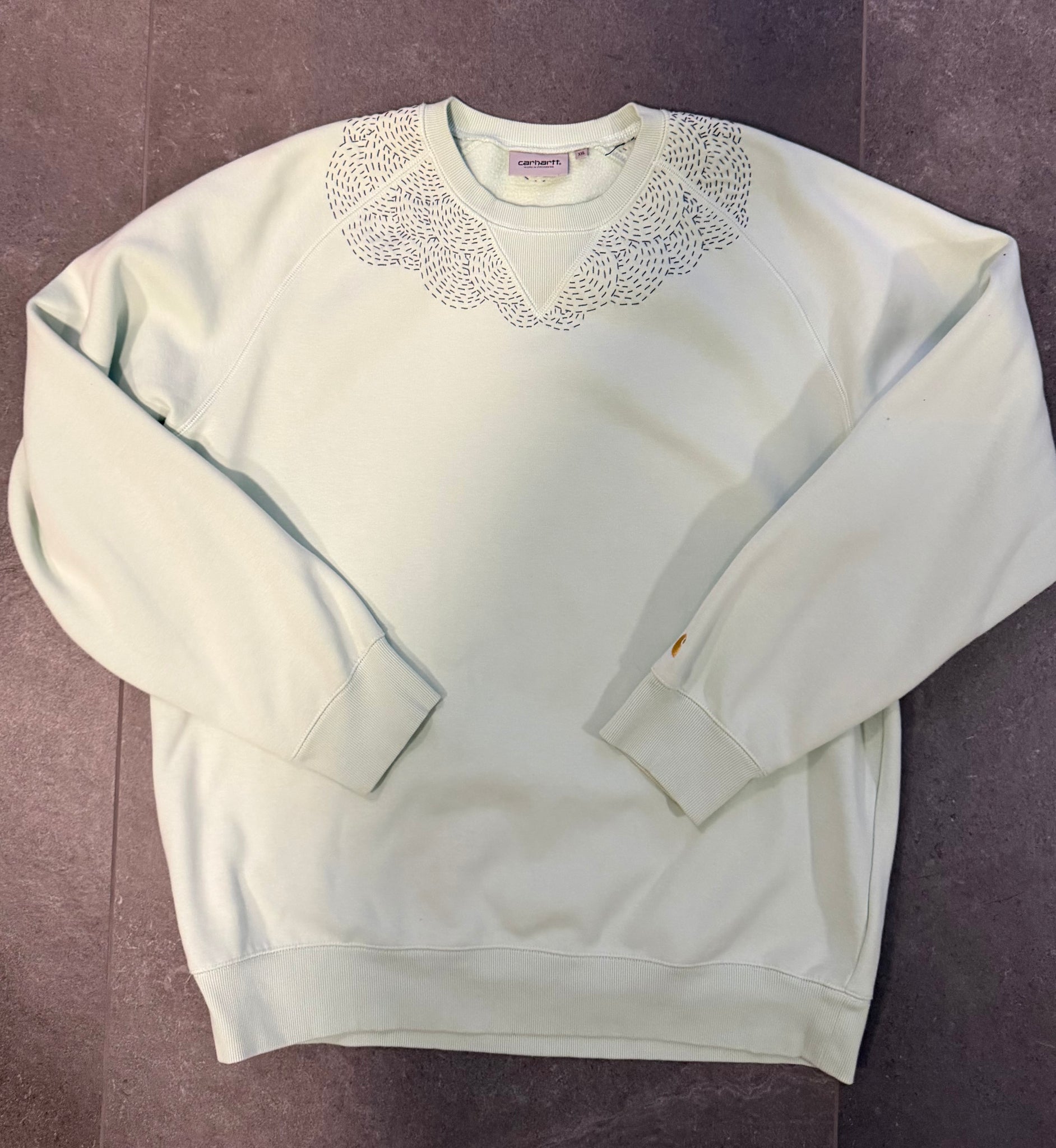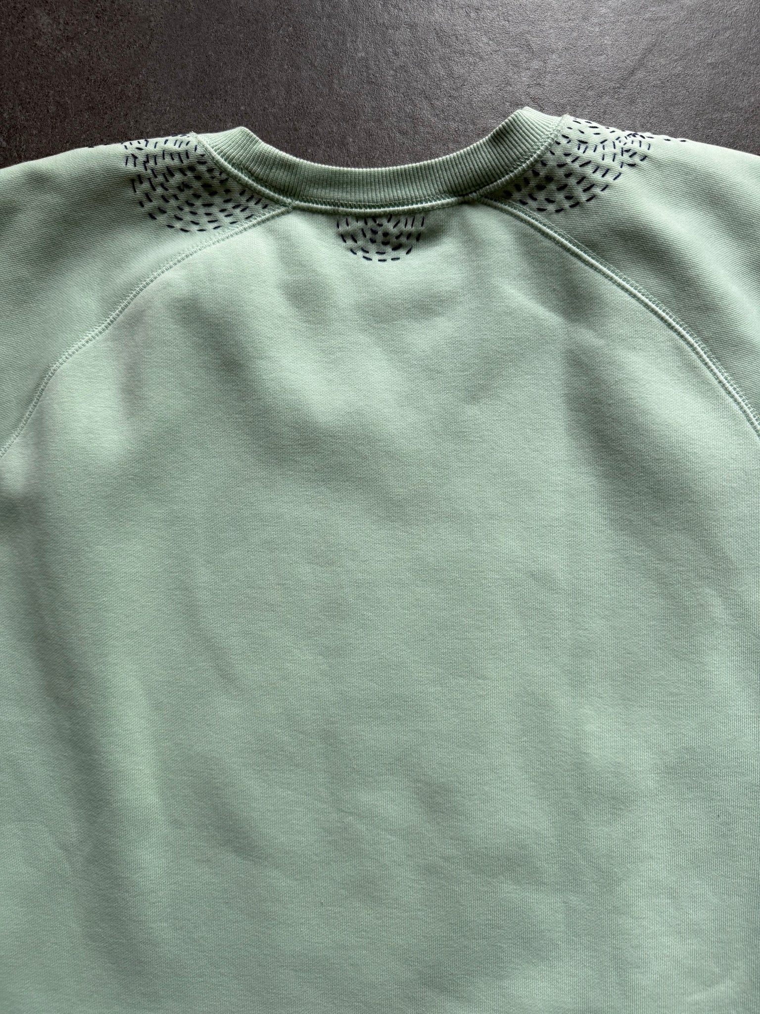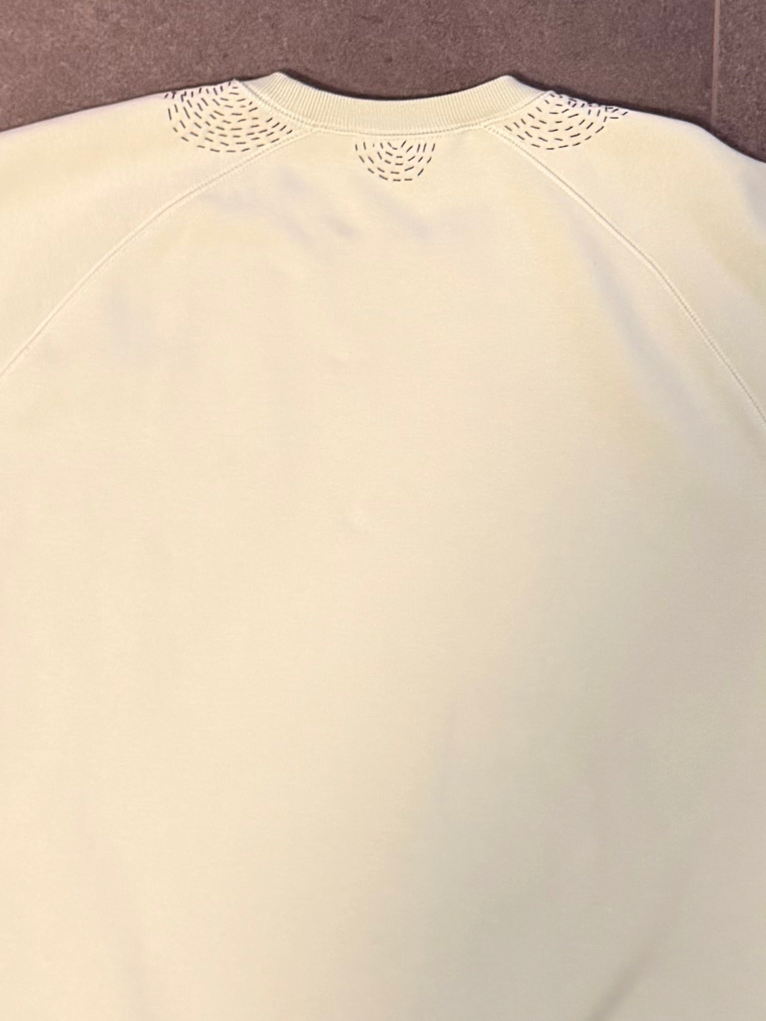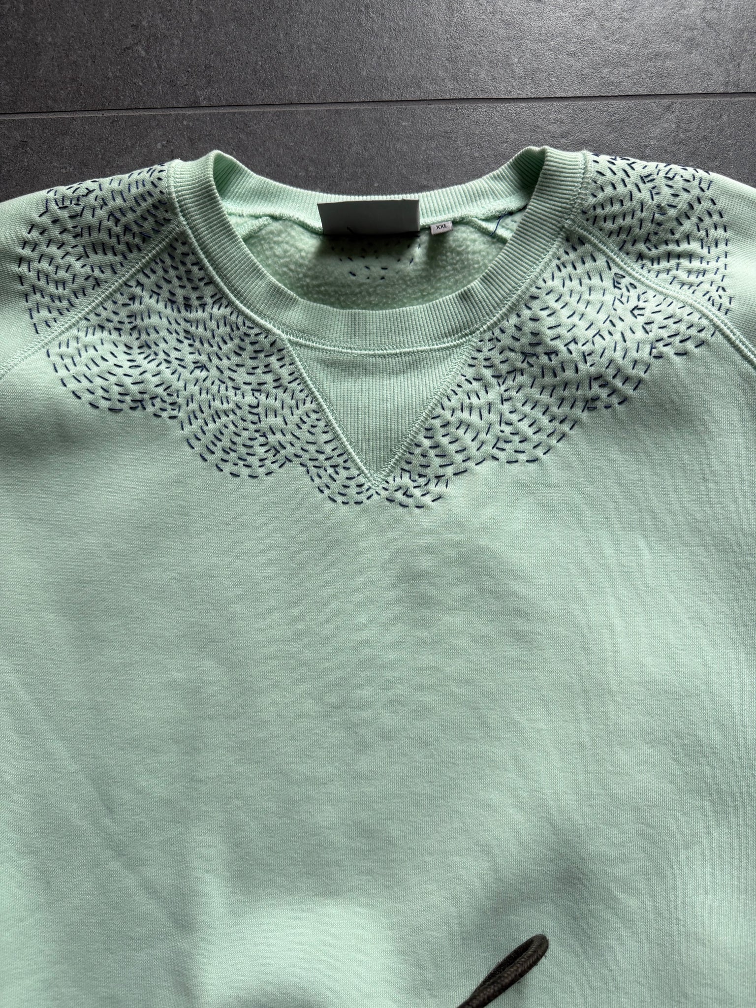 Felpa a lavorata con tecnica Sashiko, un’antica forma di ricamo giapponese nata nel XVII secolo come metodo per rinforzare e riparare i tessuti. Con il tempo, il Sashiko è diventato una vera e propria arte decorativa, caratterizzata da motivi geometrici realizzati con punti bianchi su fondo scuro: simbolo di pazienza, equilibrio e bellezza imperfetta.