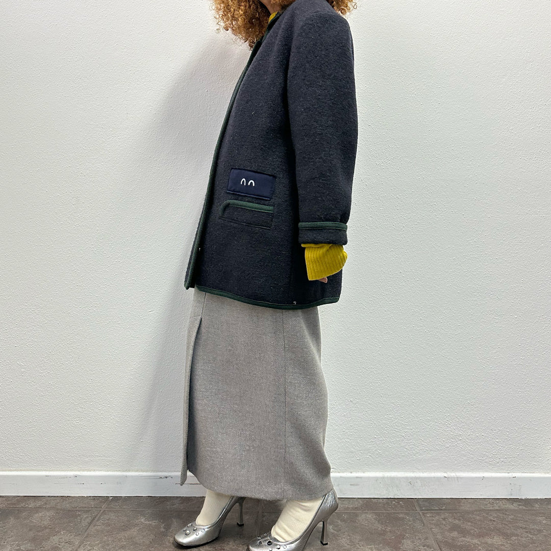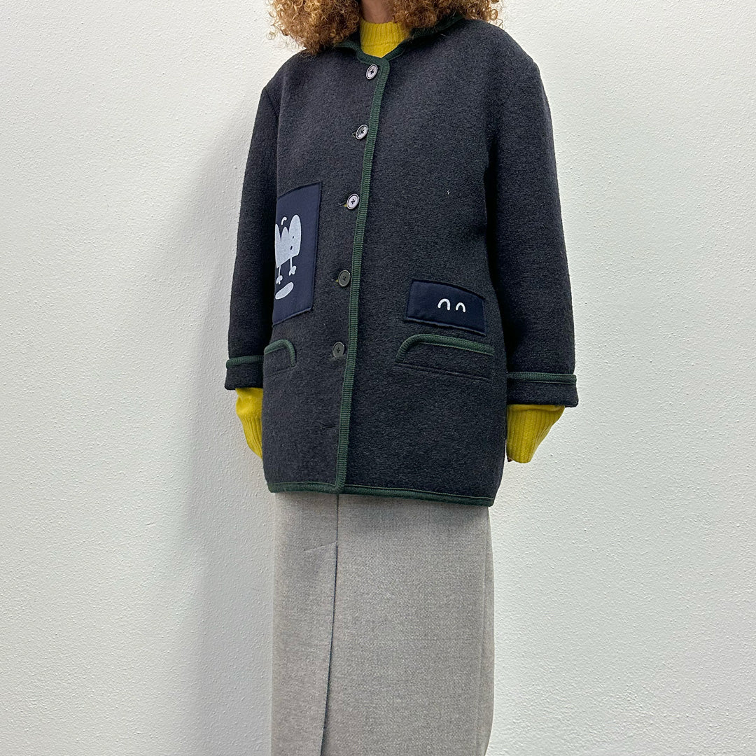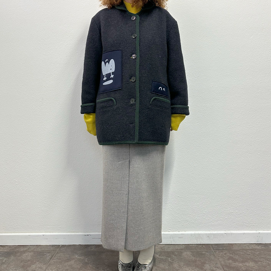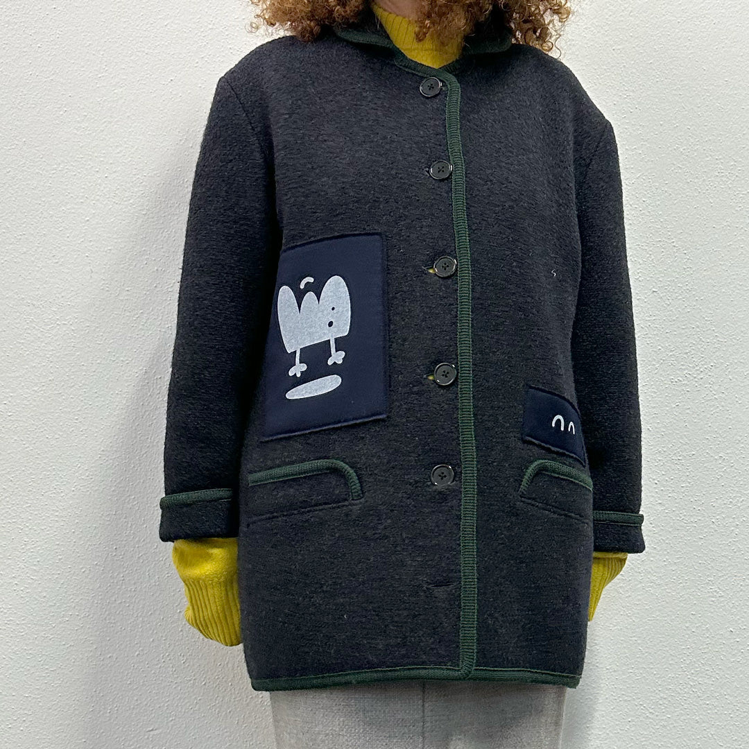 Realizzata in lana cotta grigia con rifiniture verdi, questa giacca anni ’90 a marchio Kaufmann unisce il rigore artigianale austriaco al linguaggio pop e ironico dei personaggi kawaii