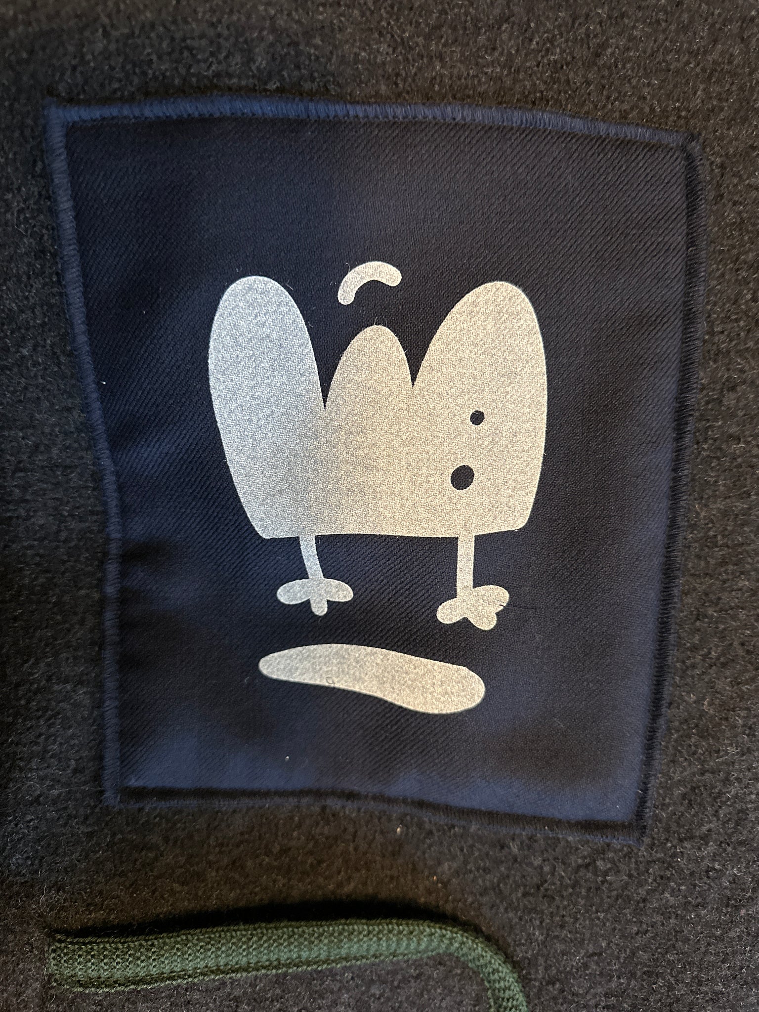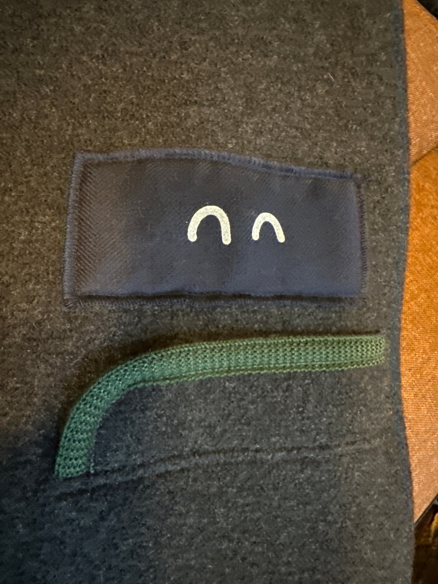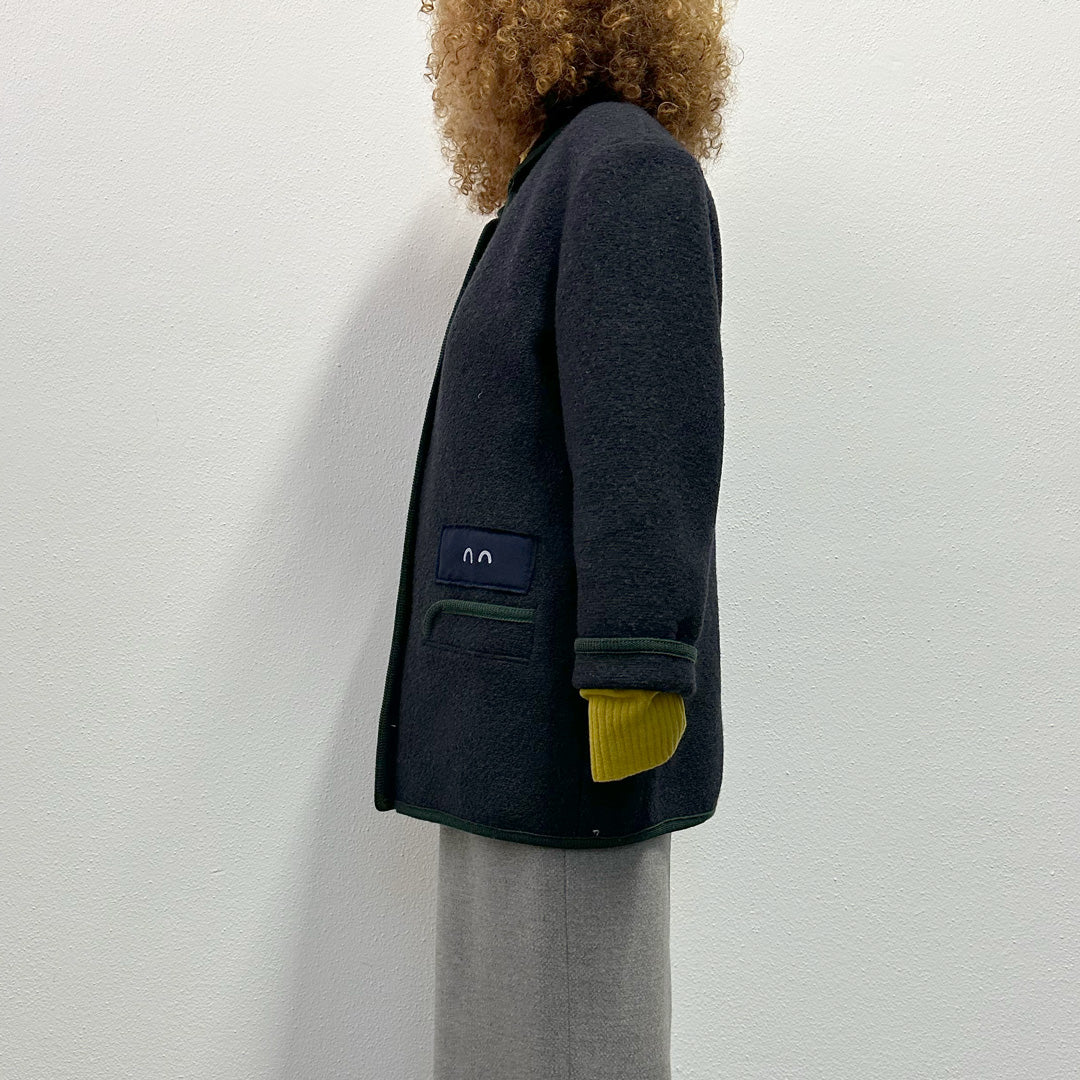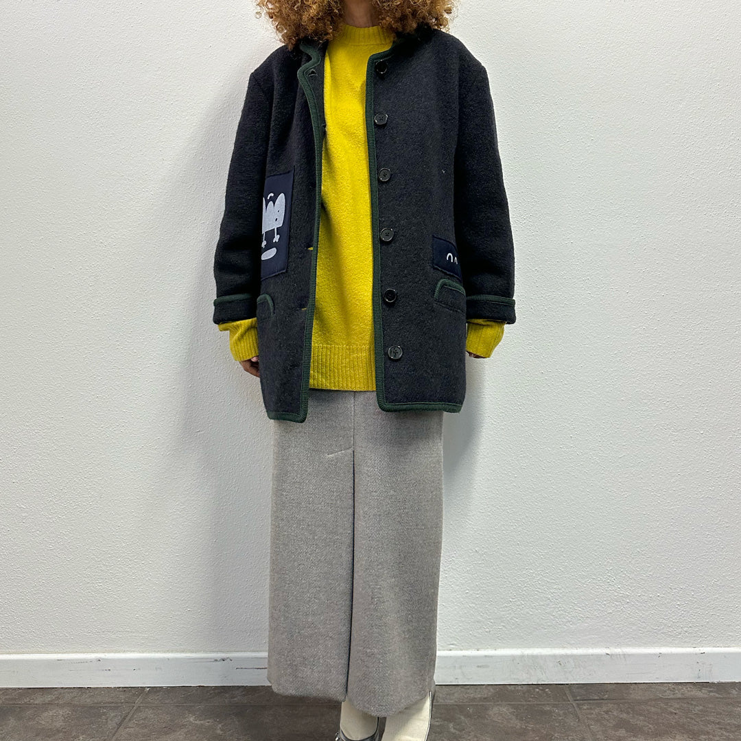 Realizzata in lana cotta grigia con rifiniture verdi, questa giacca anni ’90 a marchio Kaufmann unisce il rigore artigianale austriaco al linguaggio pop e ironico dei personaggi kawaii