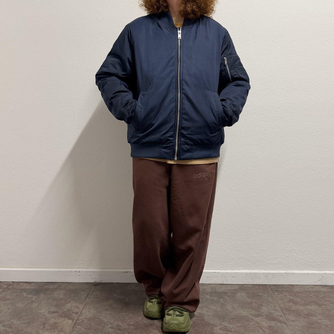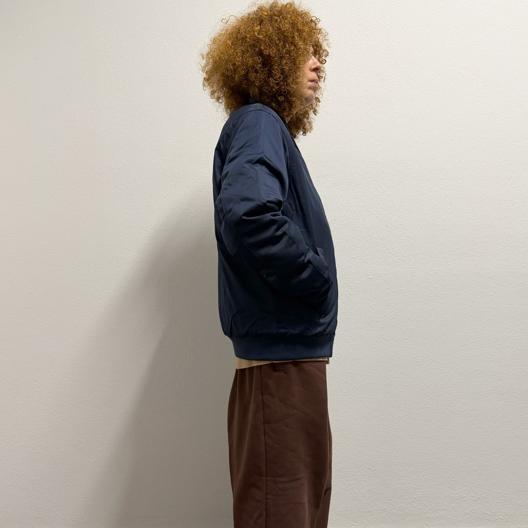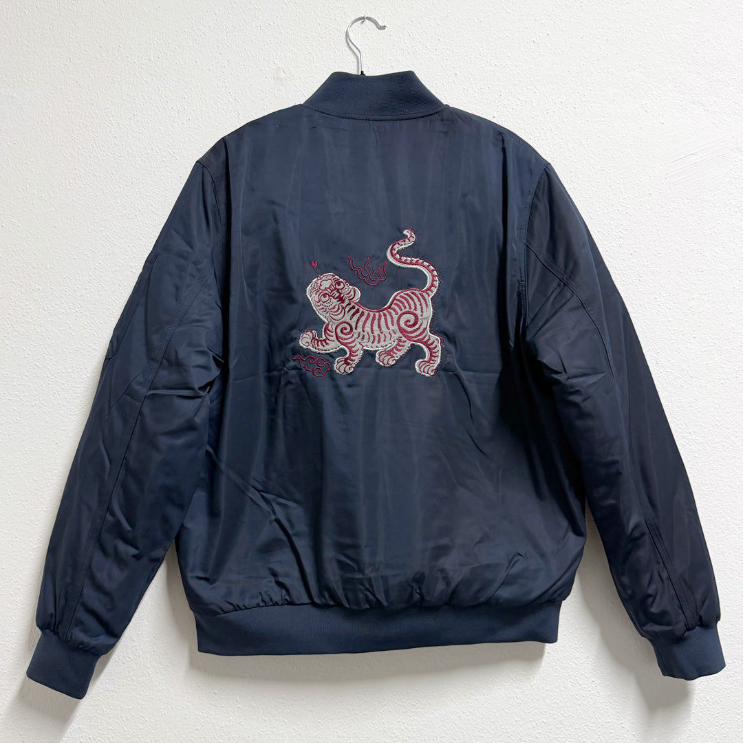 Bomber Tigre coreano color navy di poliestere riciclato con ricamo artigianale in tonalità avio e bordeaux realizzato con macchina giapponese. La tigre, simbolo tradizionale di fortuna e protezione nella cultura coreana, caratterizza questo capo unico. Zip argentata centrale, costine 1x1 su giromanica e girocollo, tasca sulla manica con quattro scomparti per penne. Tasca a filetto anteriore con bottone a pressione e tasca interna al petto. Completamente imbottito con aperture interne zippate per personalizzazione. Materiale sostenibile, fluorine-free. Capo esclusivo con misure specifiche indicate in foto.