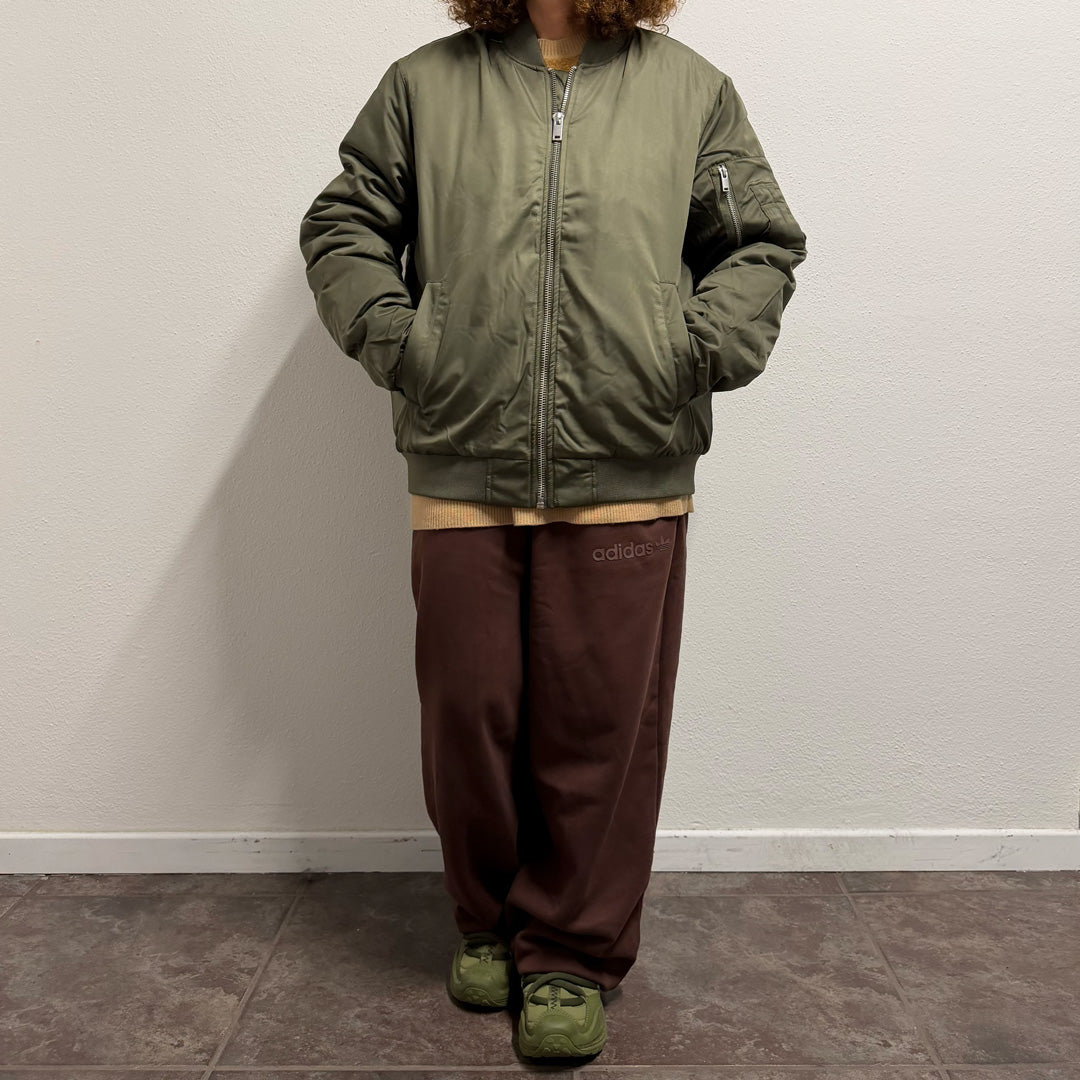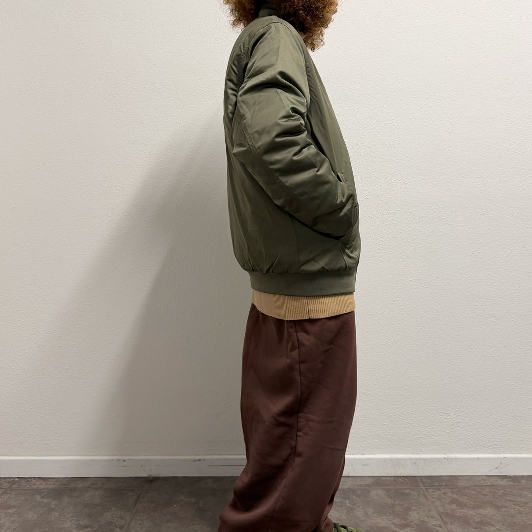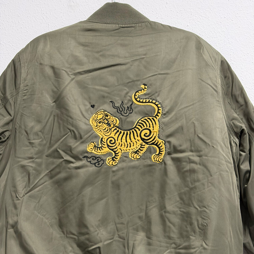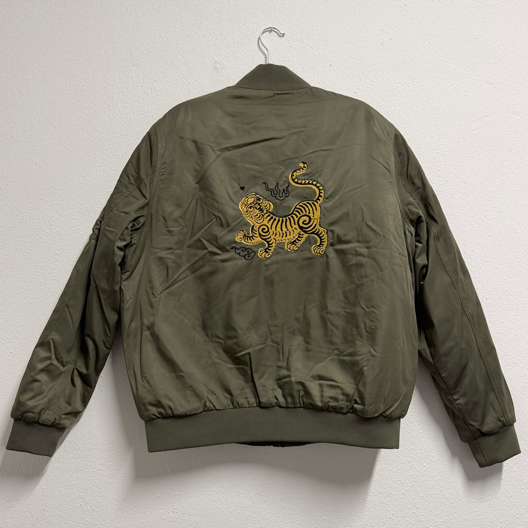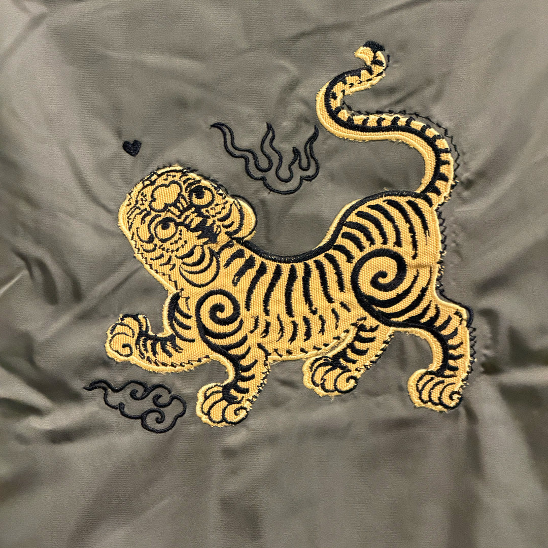 Bomber Tigre coreano color kakhi di poliestere riciclato con ricamo artigianale in tonalità senape e nero realizzato con macchina giapponese. La tigre, simbolo tradizionale di fortuna e protezione nella cultura coreana, caratterizza questo capo unico. Zip argentata centrale, costine 1x1 su giromanica e girocollo, tasca sulla manica con quattro scomparti per penne. Tasca a filetto anteriore con bottone a pressione e tasca interna al petto. Completamente imbottito con aperture interne zippate per personalizzazione. Materiale sostenibile, fluorine-free. Capo esclusivo con misure specifiche indicate in foto.