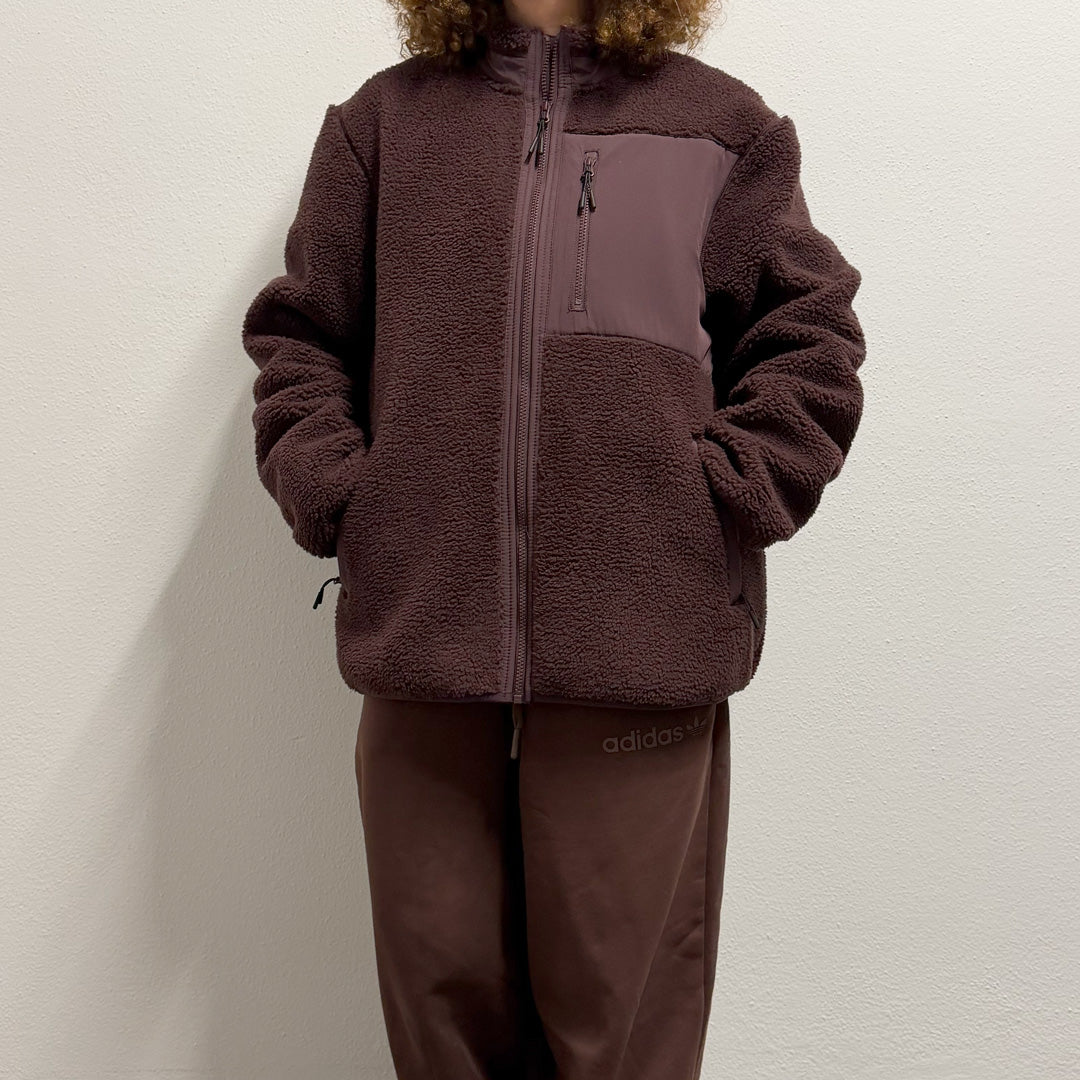 Sherpa jacket color bordeaux con ricamo artigianale tigre coreana color rosa antico e blu , 100% poliestere riciclato , super caldo e morbido .