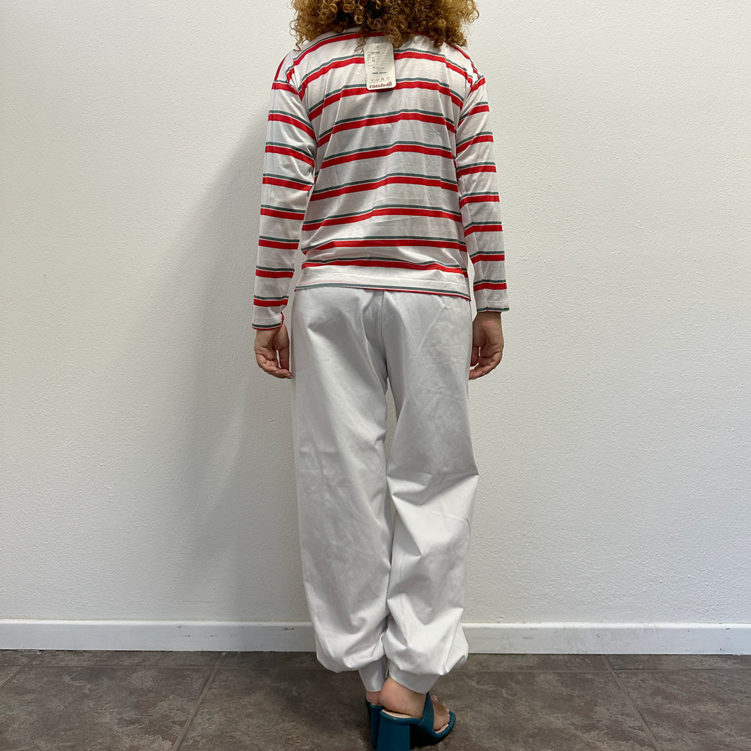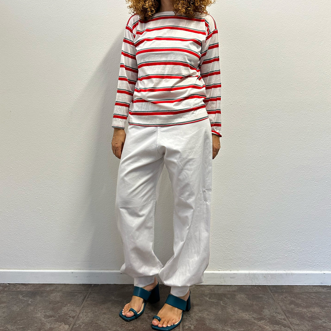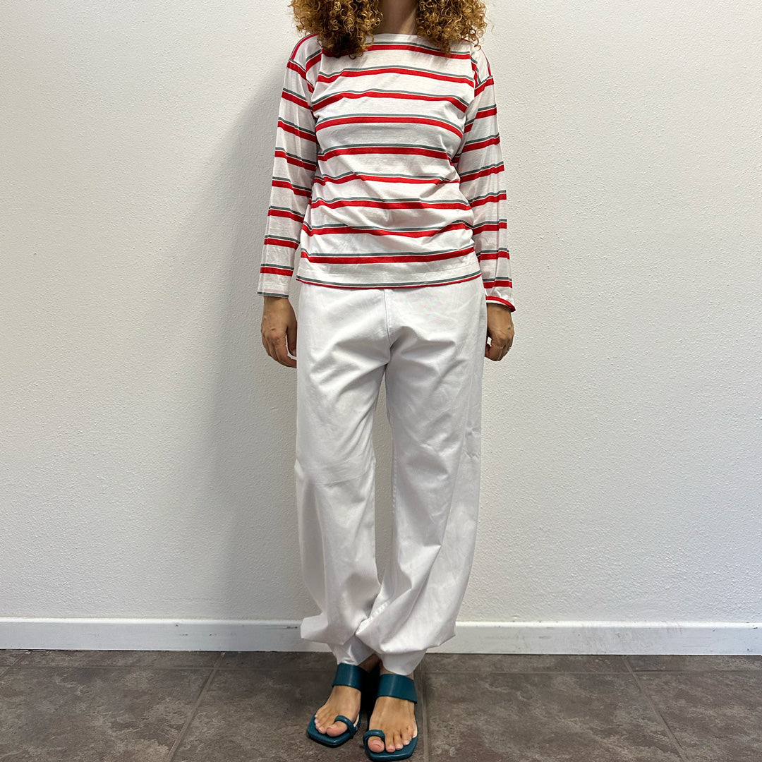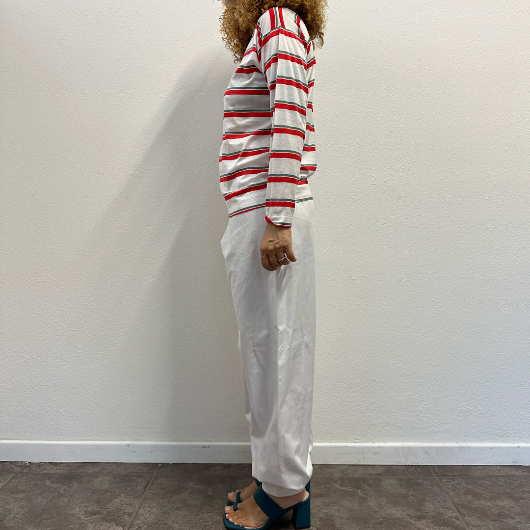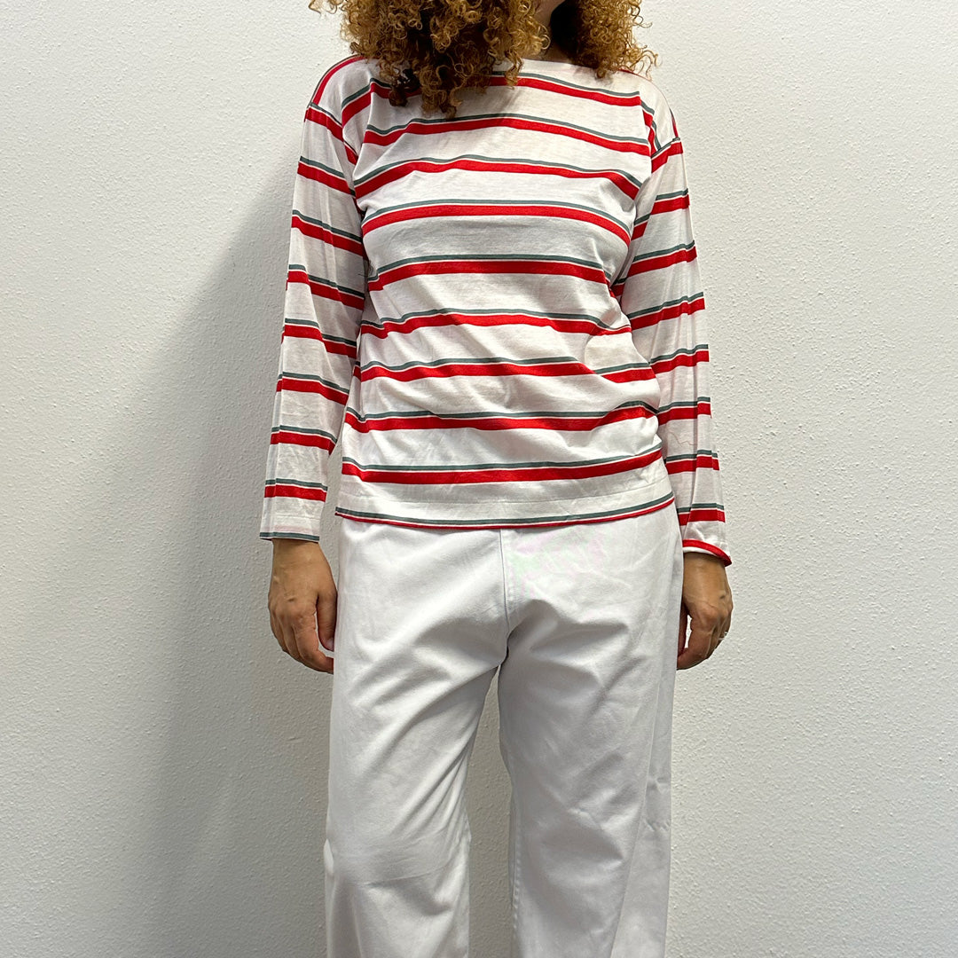 Rara t-shirt vintage deadstock anni ’80 in morbido filo di Scozia, bianca con righe rosse e grigie. Modello con scollo a barca e vestibilità elegante e senza tempo. Capo mai indossato, ancora con cartellino originale.