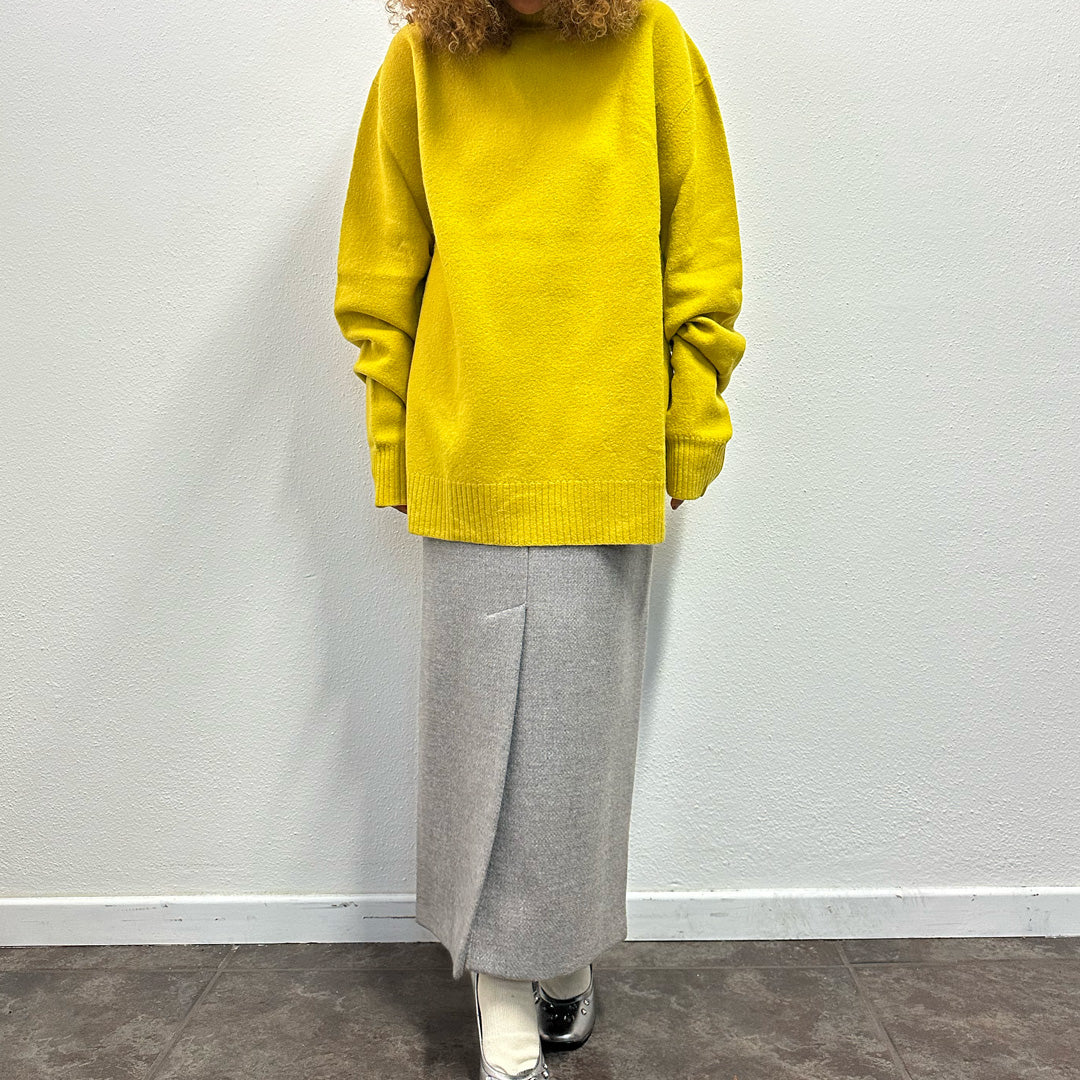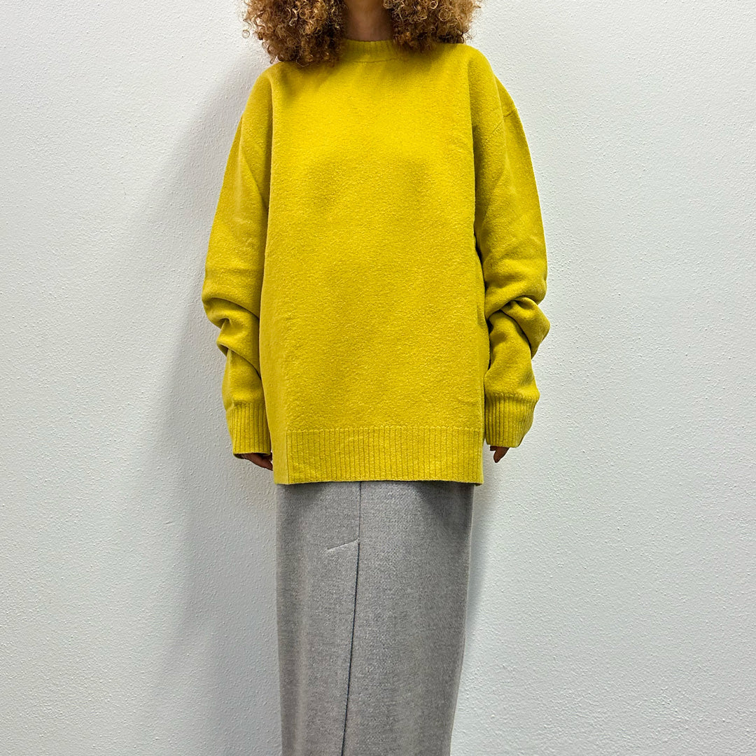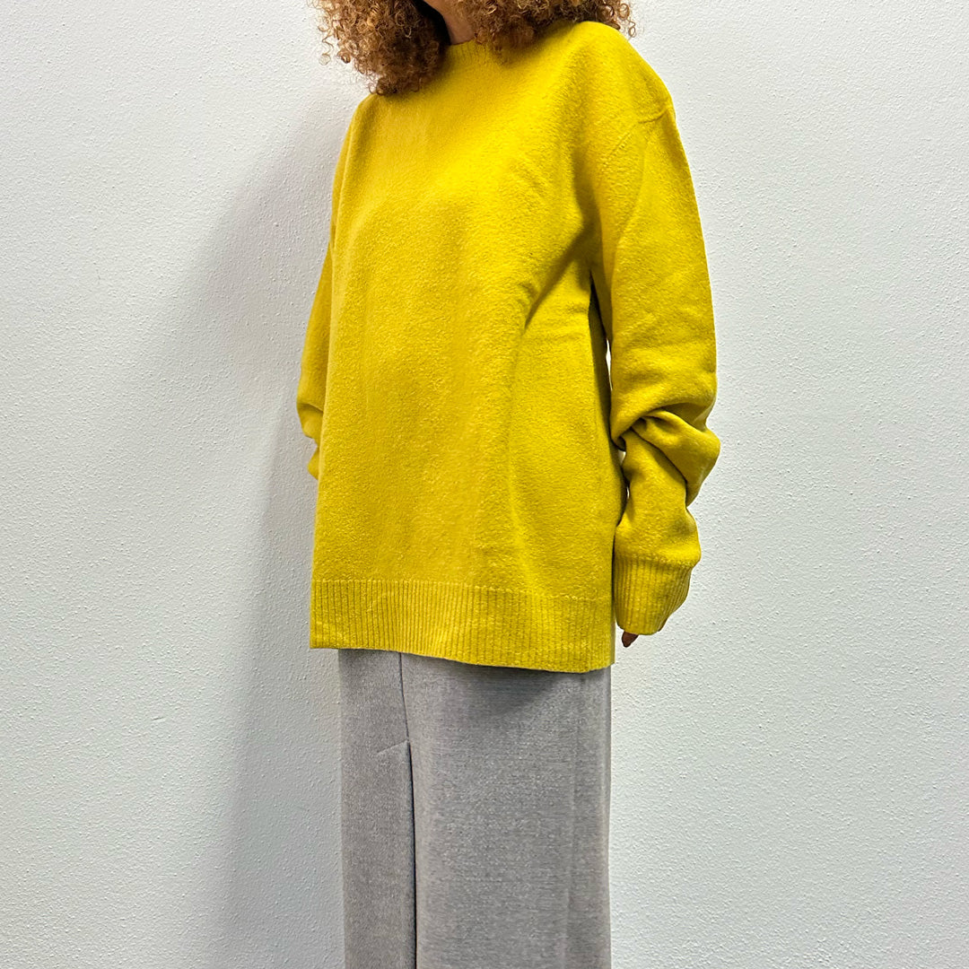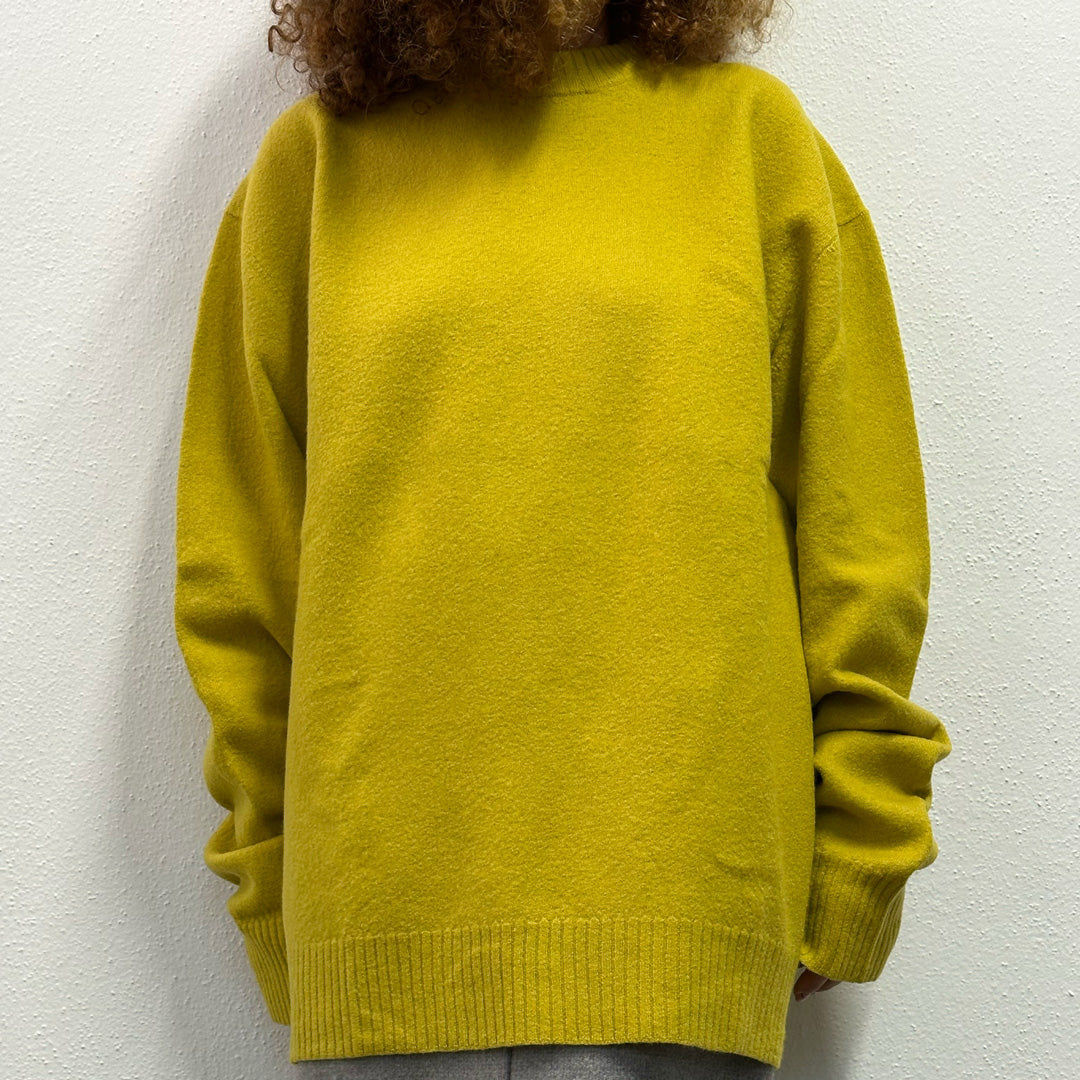 Maglione lana follata coro senape ,100% lana made in Italy ,davanti e’ leggermente piu’ corto . A giro collo , peso medio . tg L . Deadstock Nuovo mai stato usato senza etichetta.