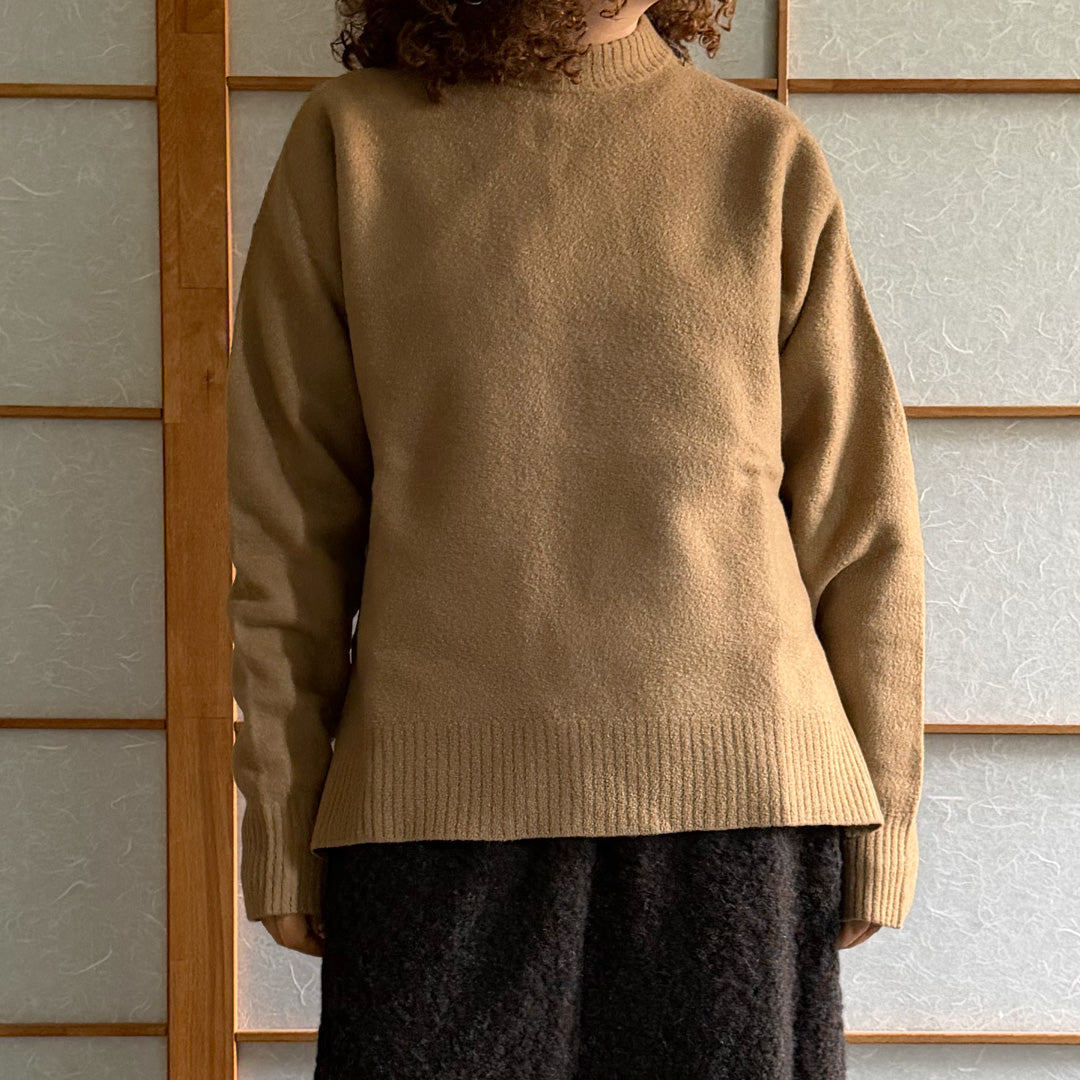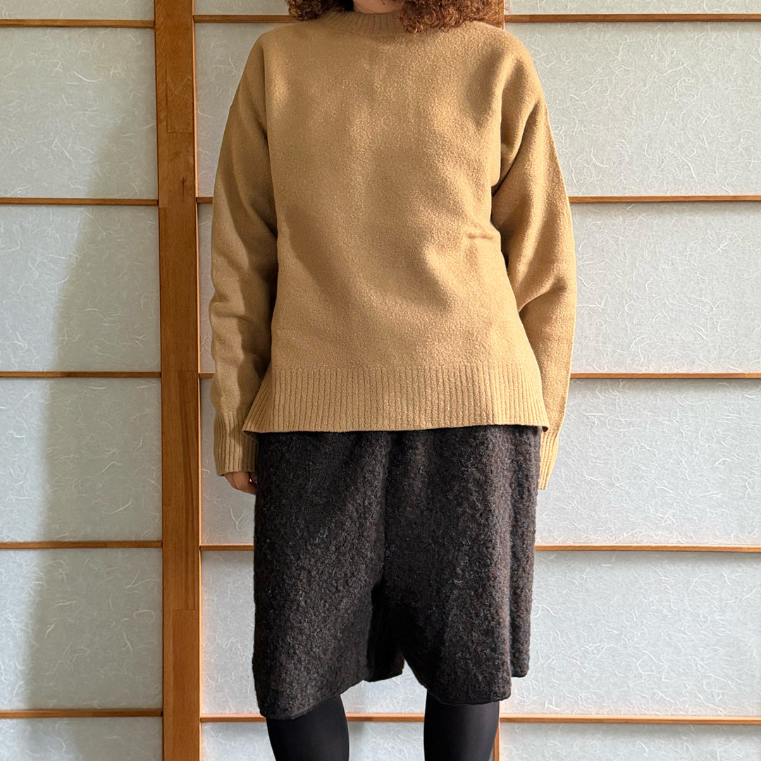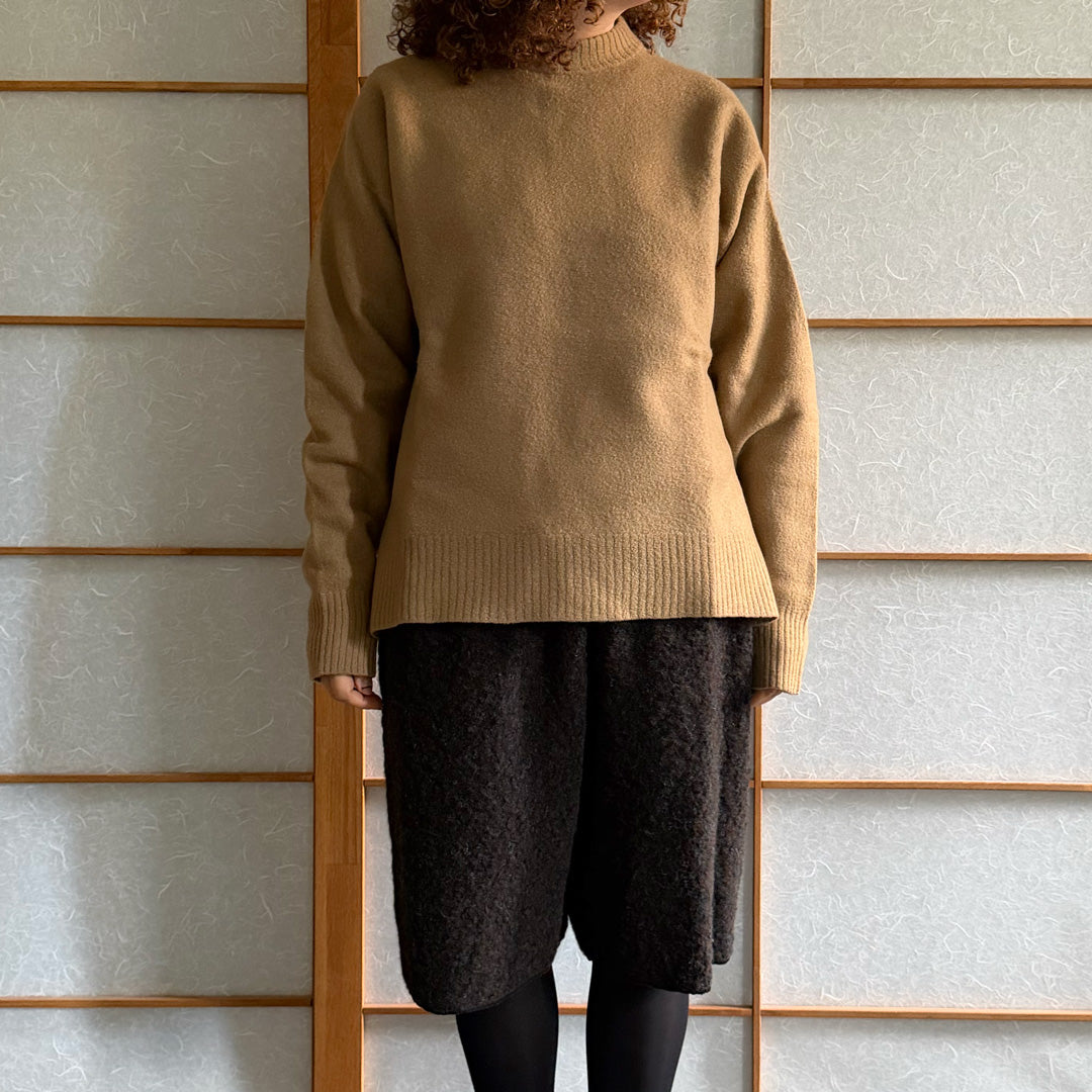 Maglione lana follata color cammello ,100% lana made in Italy , girocollo peso medio , con spacchi laterali tg S. Deadstock Nuovo mai stato usato senza etichetta.