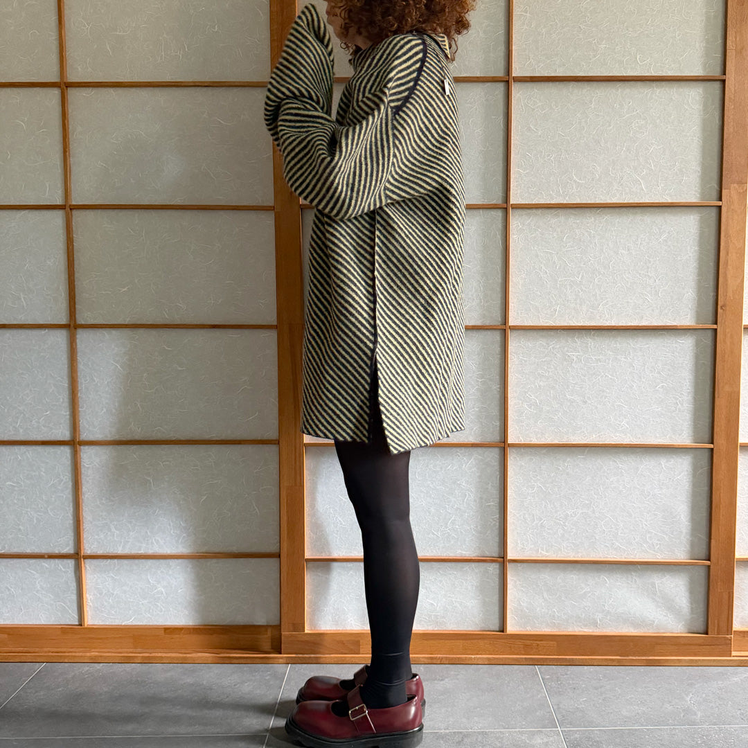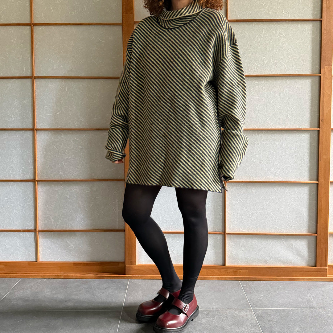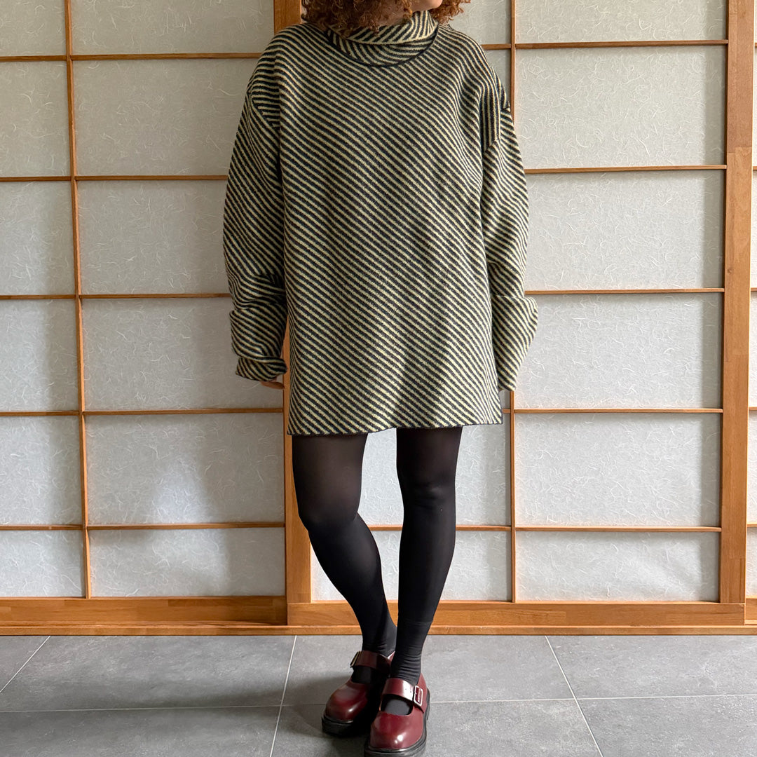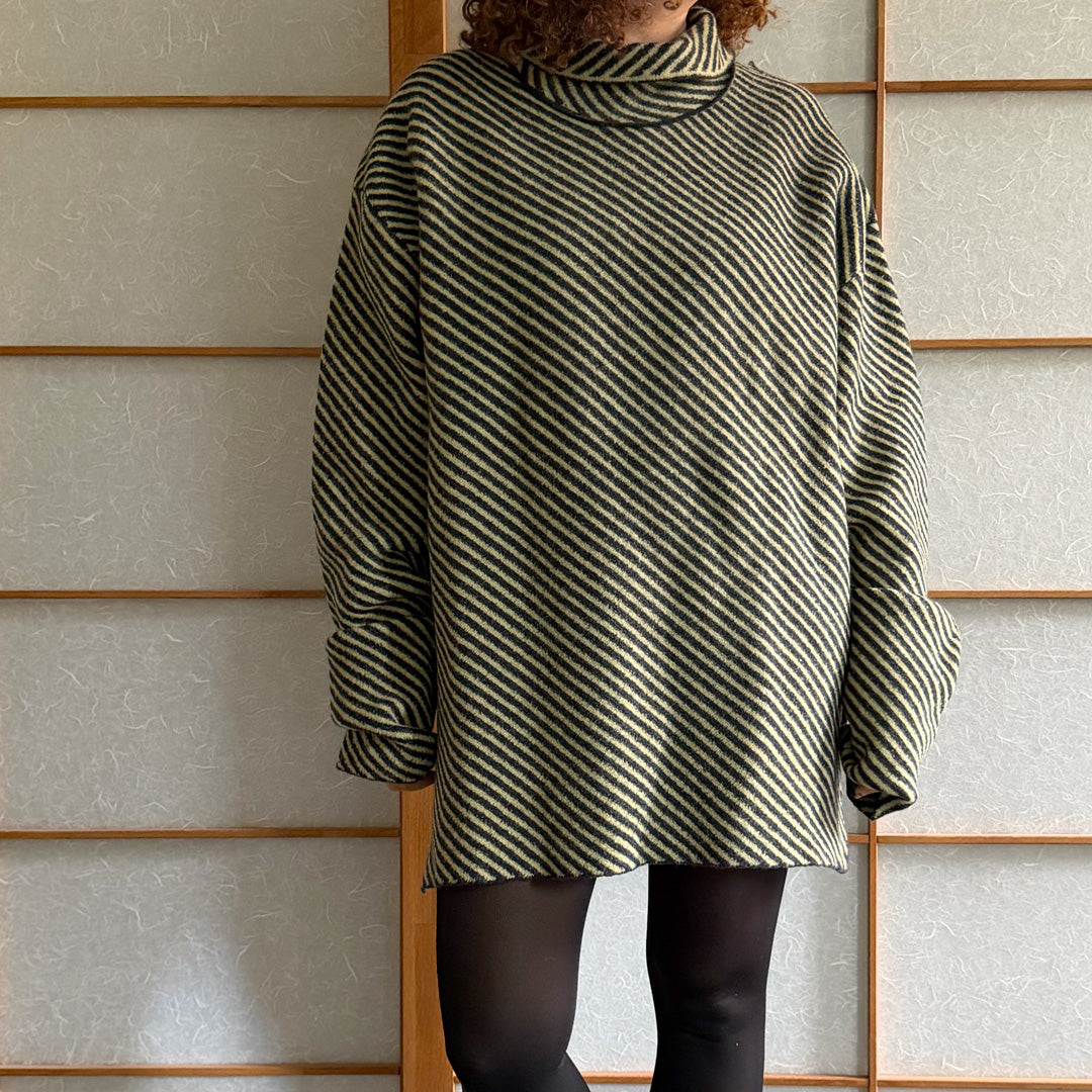 Maglione lana follata a righe oblique giallo e grigio ,100% lana made in Italy,con spacchi laterali . A collo alto con punte sul retro , peso medio . tgXL . Deadstock Nuovo mai stato usato senza etichetta.