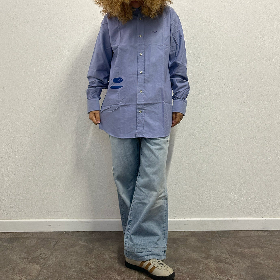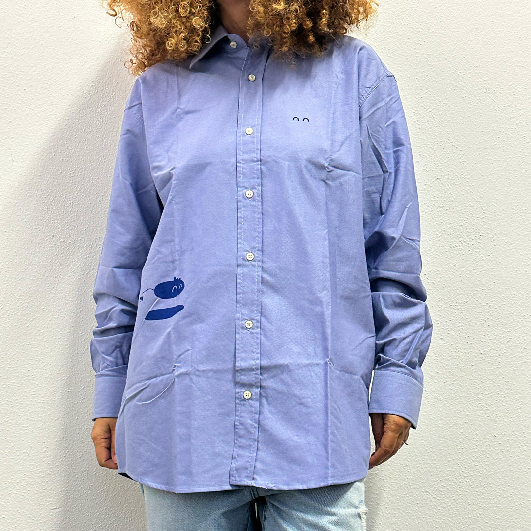 Camicia unica nel suo genere, 100% cotone color avio , . Il pezzo è impreziosito da una serigrafia originale fatta a mano dall’artista Gigi Tarantola , la stampa puo' leggermente cambiare posizione essendo serigrafata a mano .