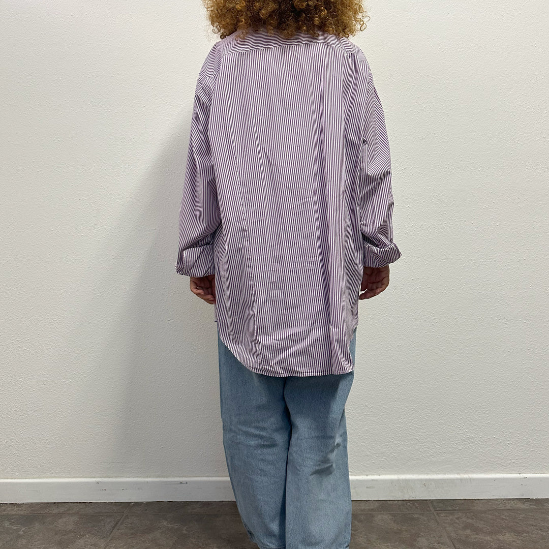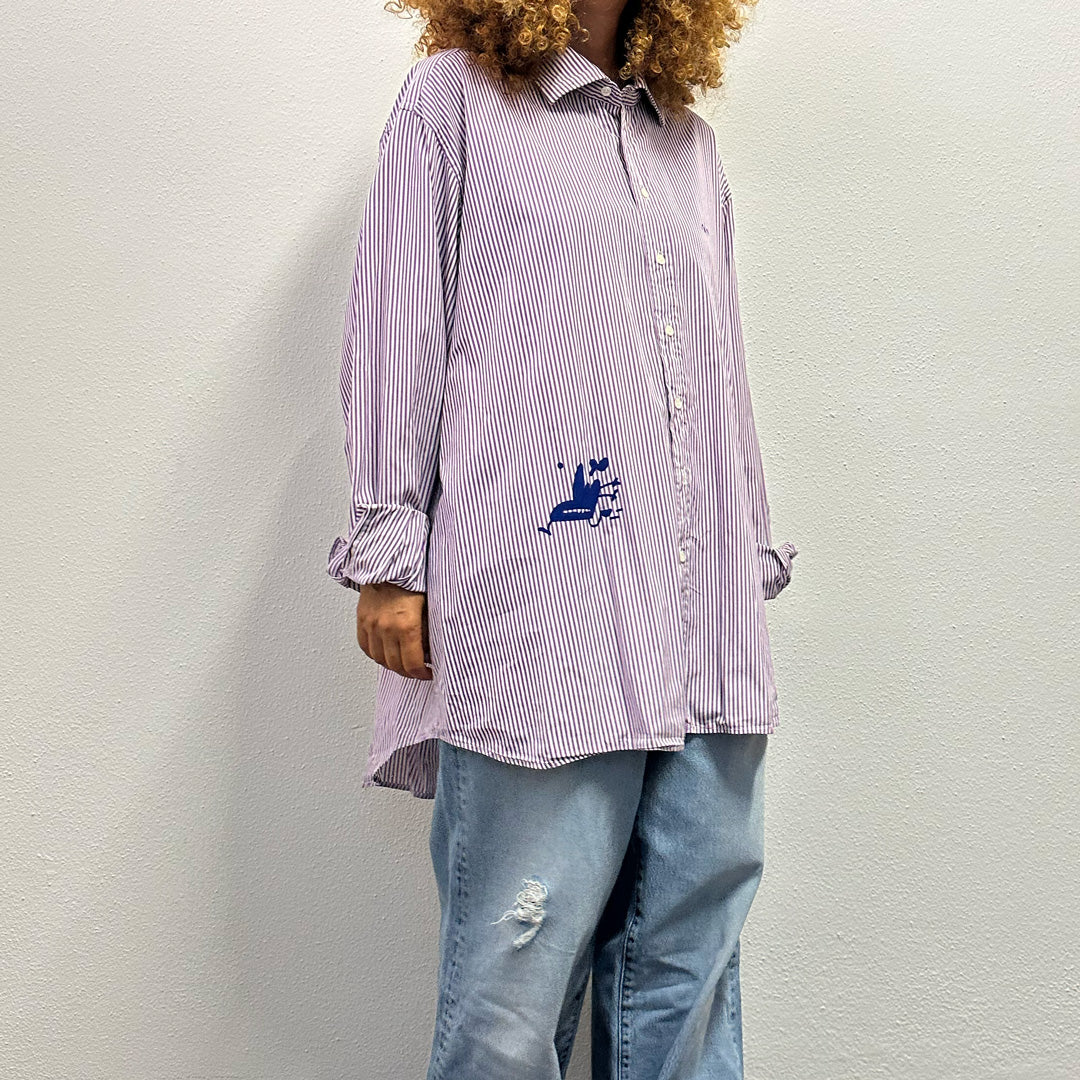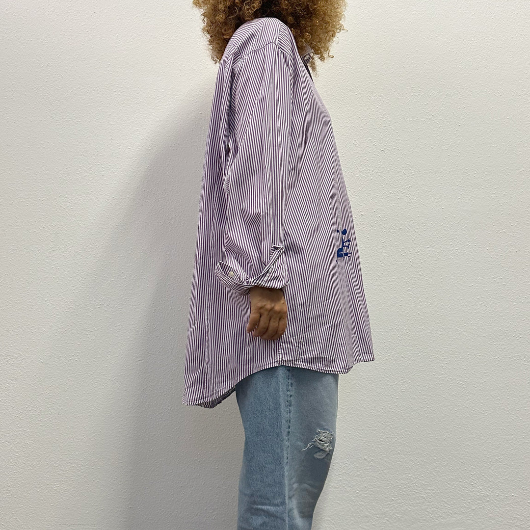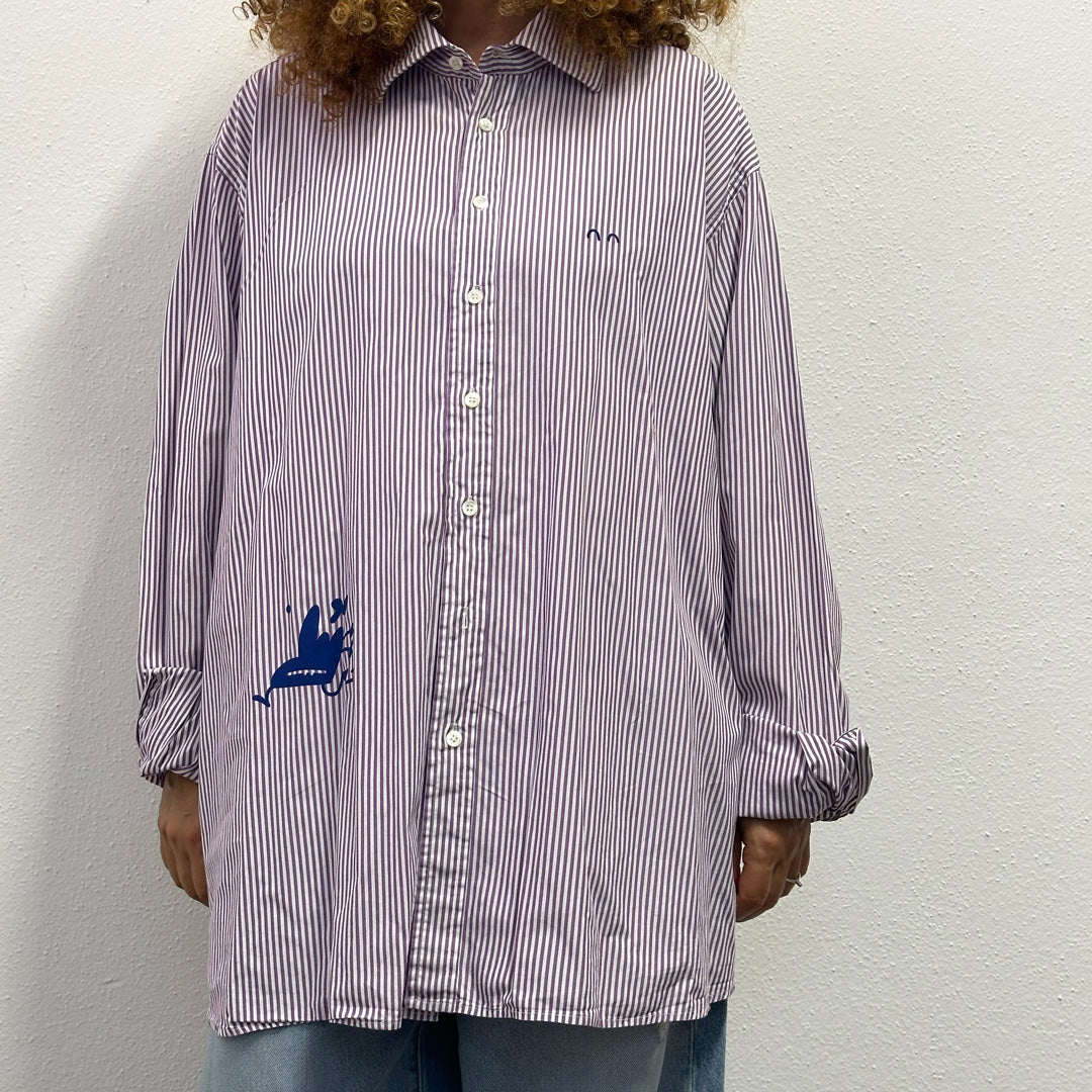 Camicia unica nel suo genere, nessuna label al tatto direi decisamente 100% cotone a righe bianche e viola , con lavorazione sartoriale e dettagli ricercati. Il pezzo è impreziosito da una serigrafia originale fatta a mano dall’artista Gigi Tarantola