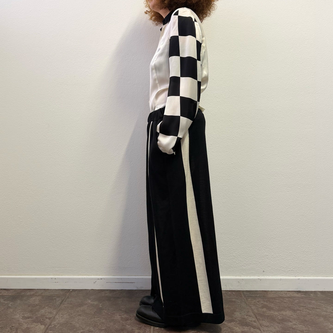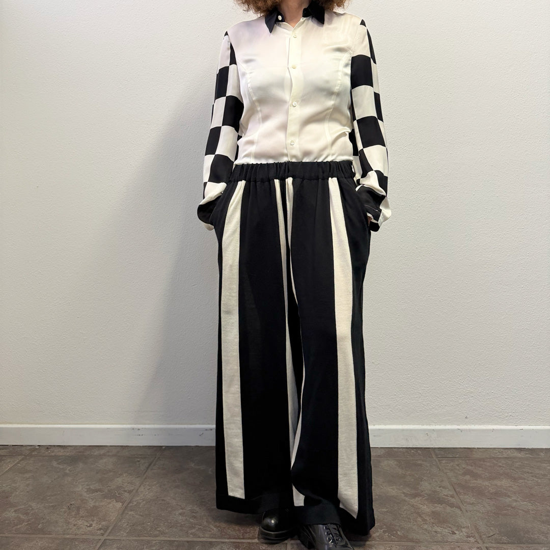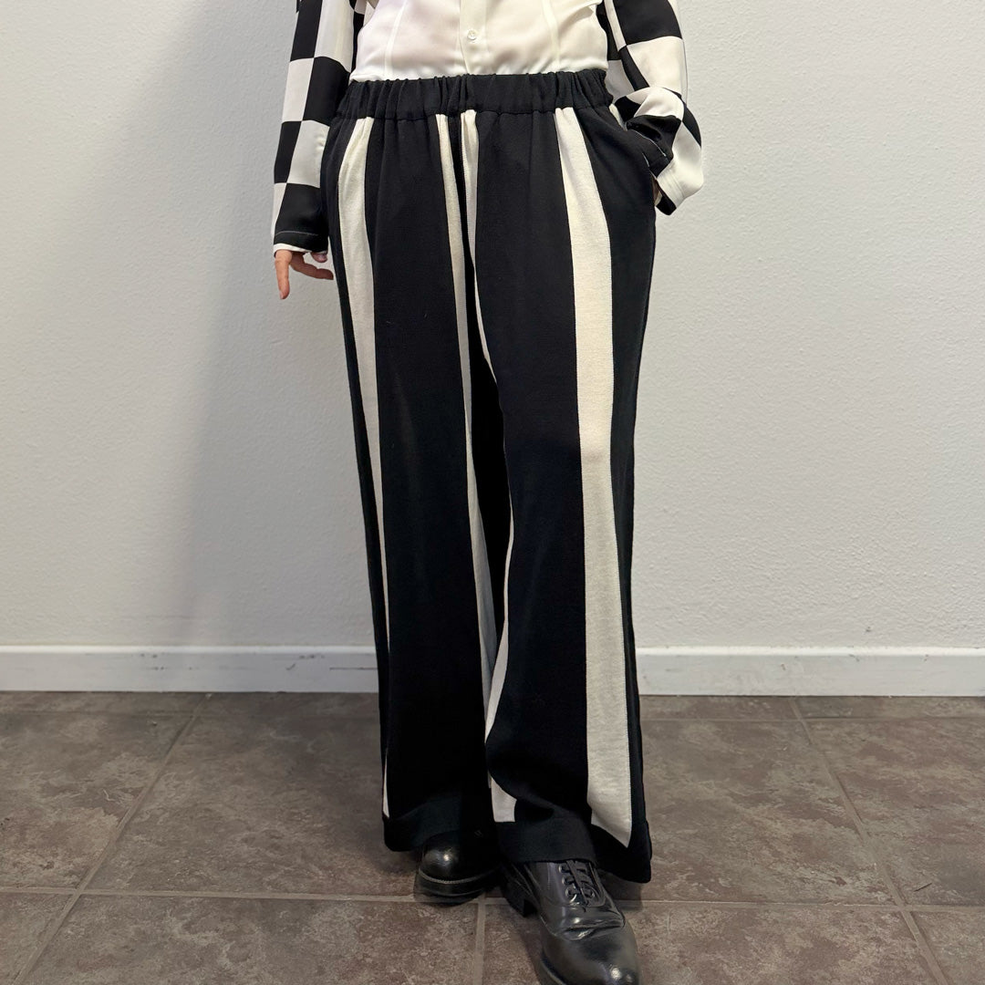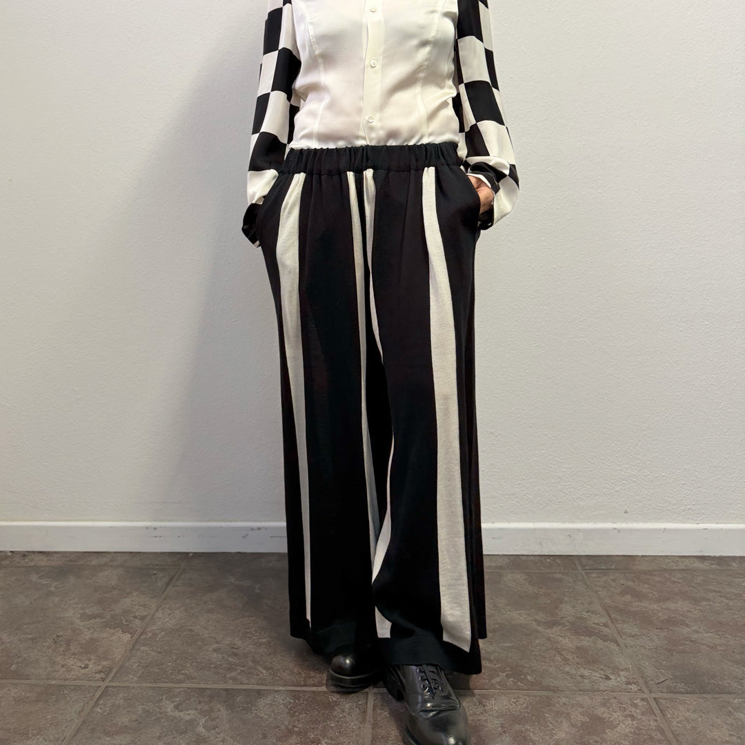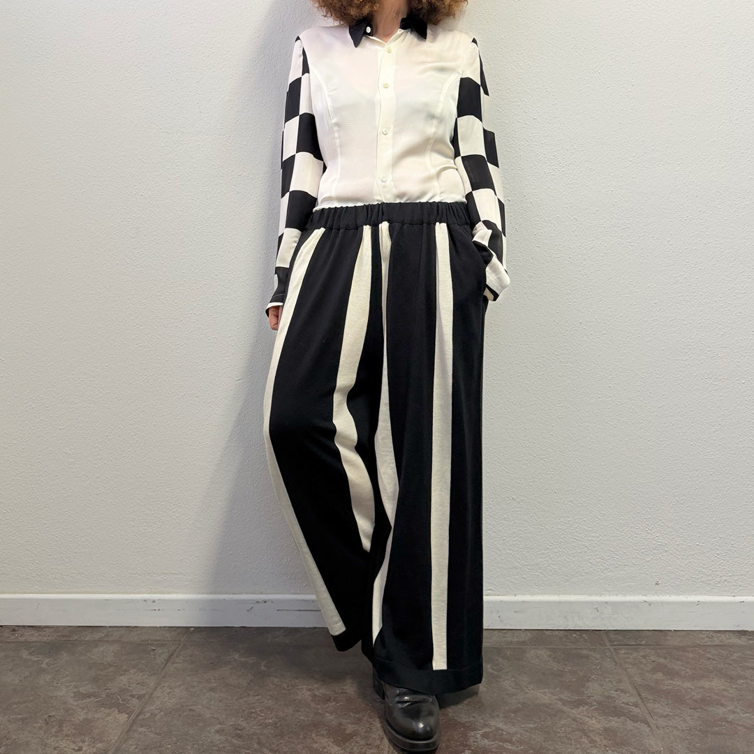 Pantaloni a righe verticali bianche e nere, realizzati in 100% fresco lana merino, leggeri e traspiranti, perfetti per la mezza stagione e per un look elegante ma versatile.